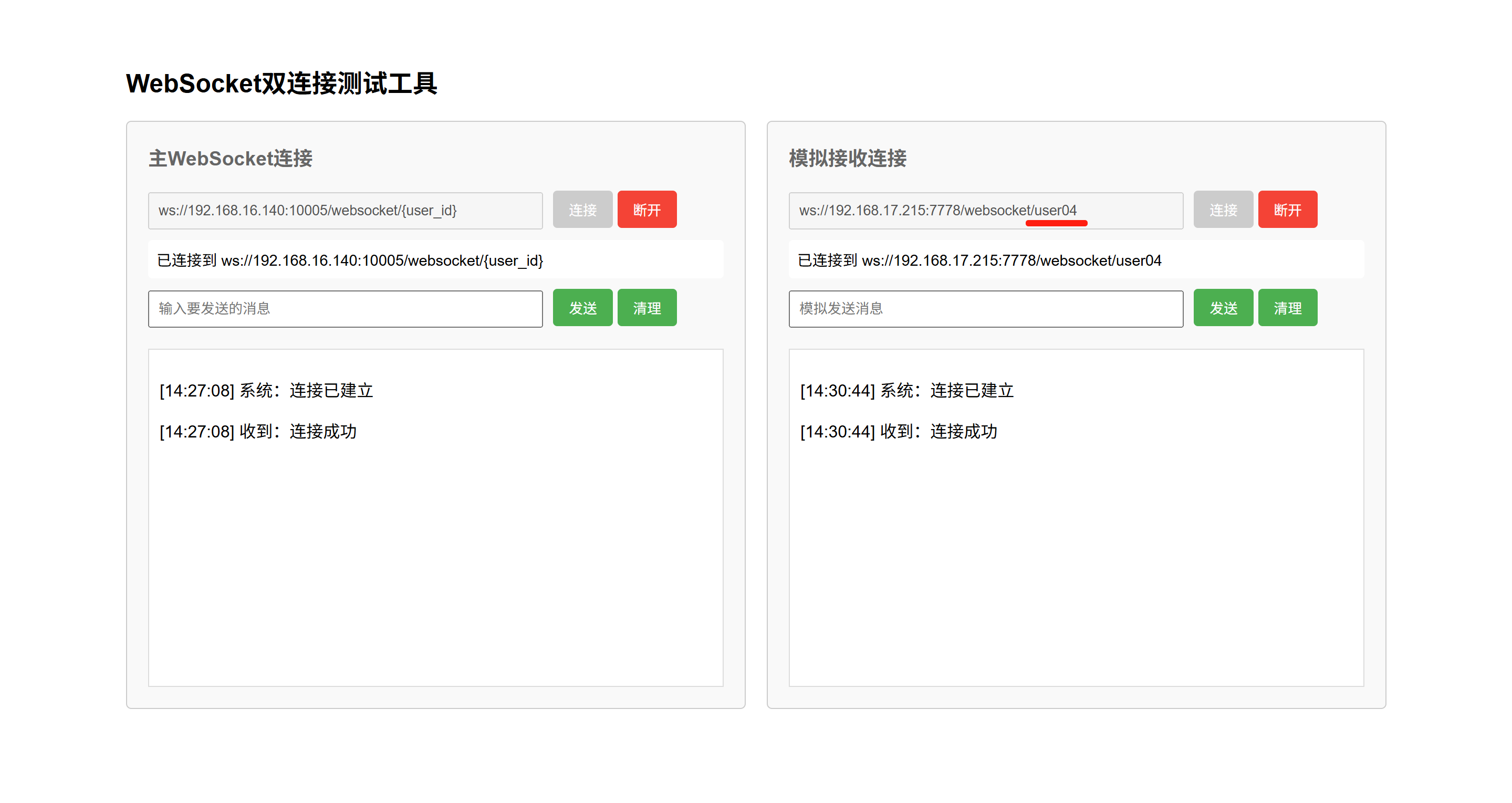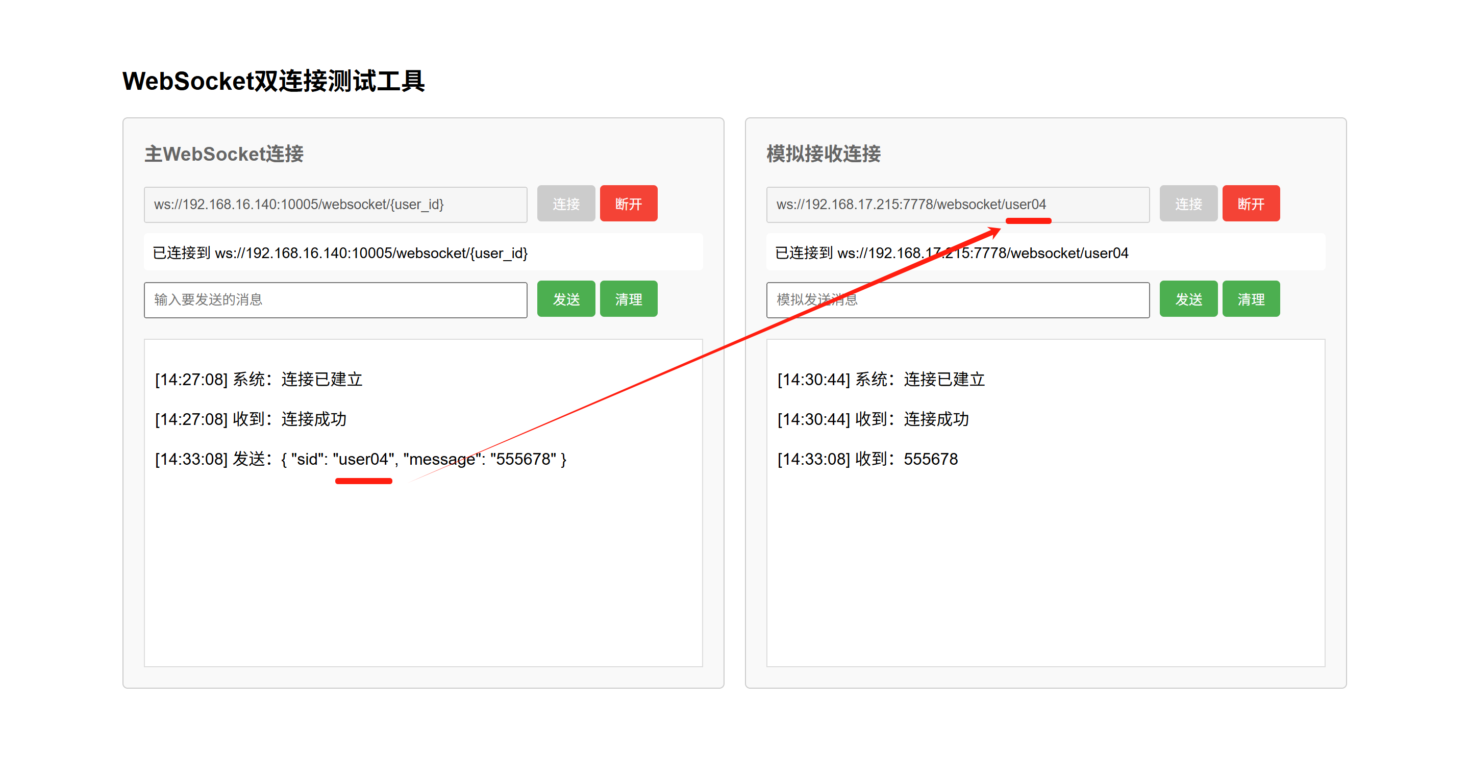 主WebSocket连接消息输入框输入如下示例发送的消息,点击“发送”按钮,即可发送消息,然后在模拟接收连接消息输出框中可以看到接收到的消息。如下图: