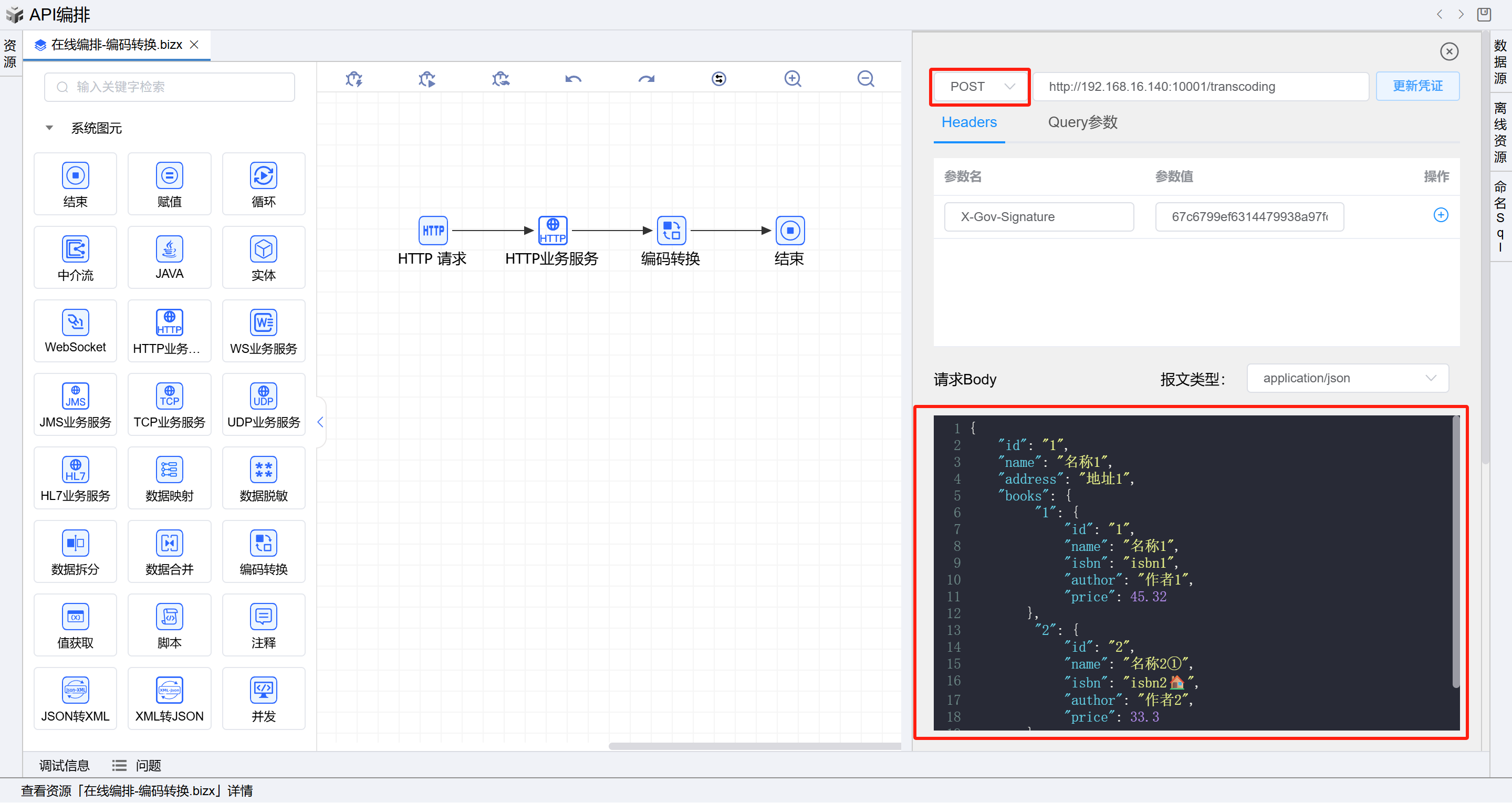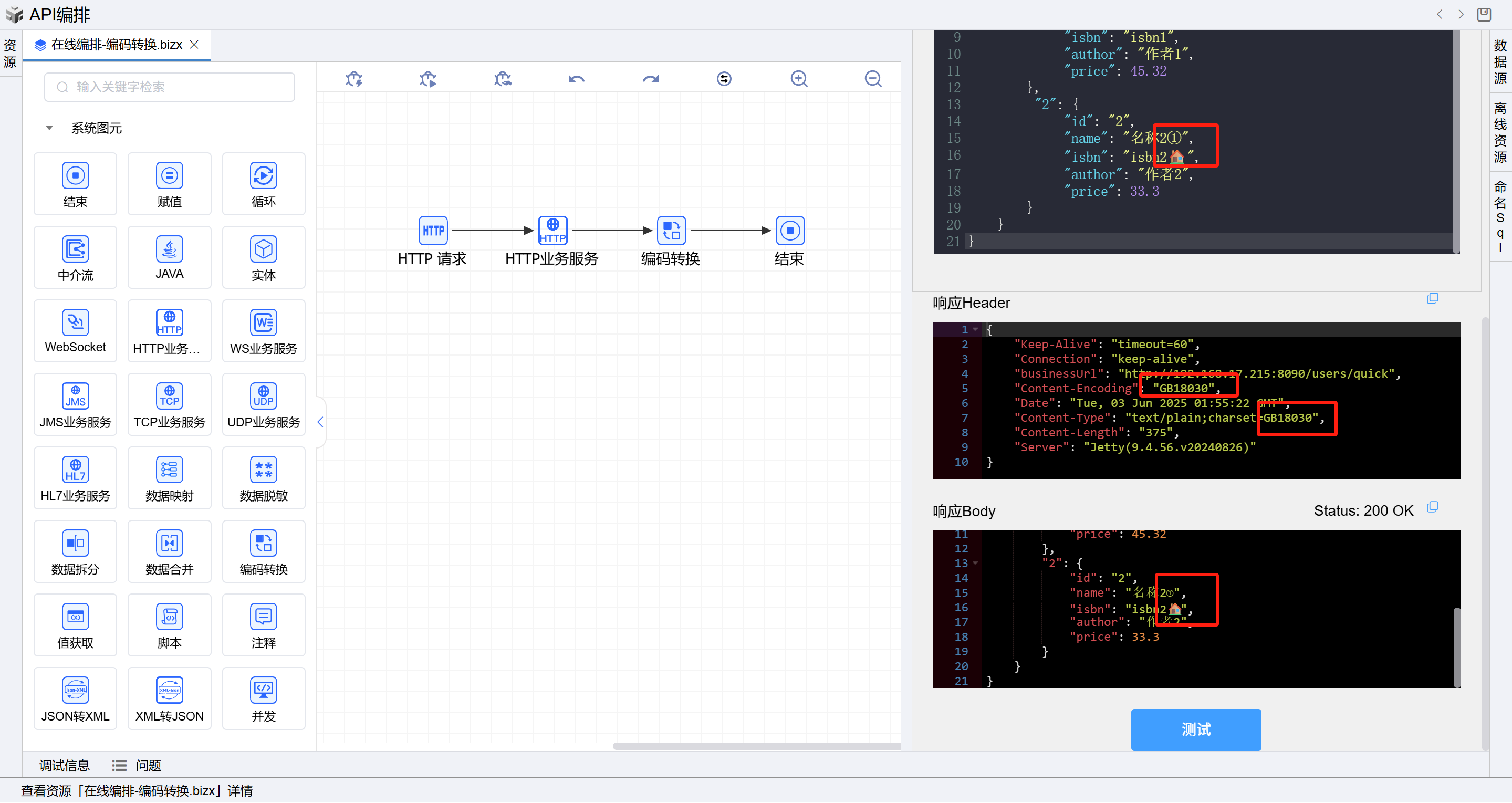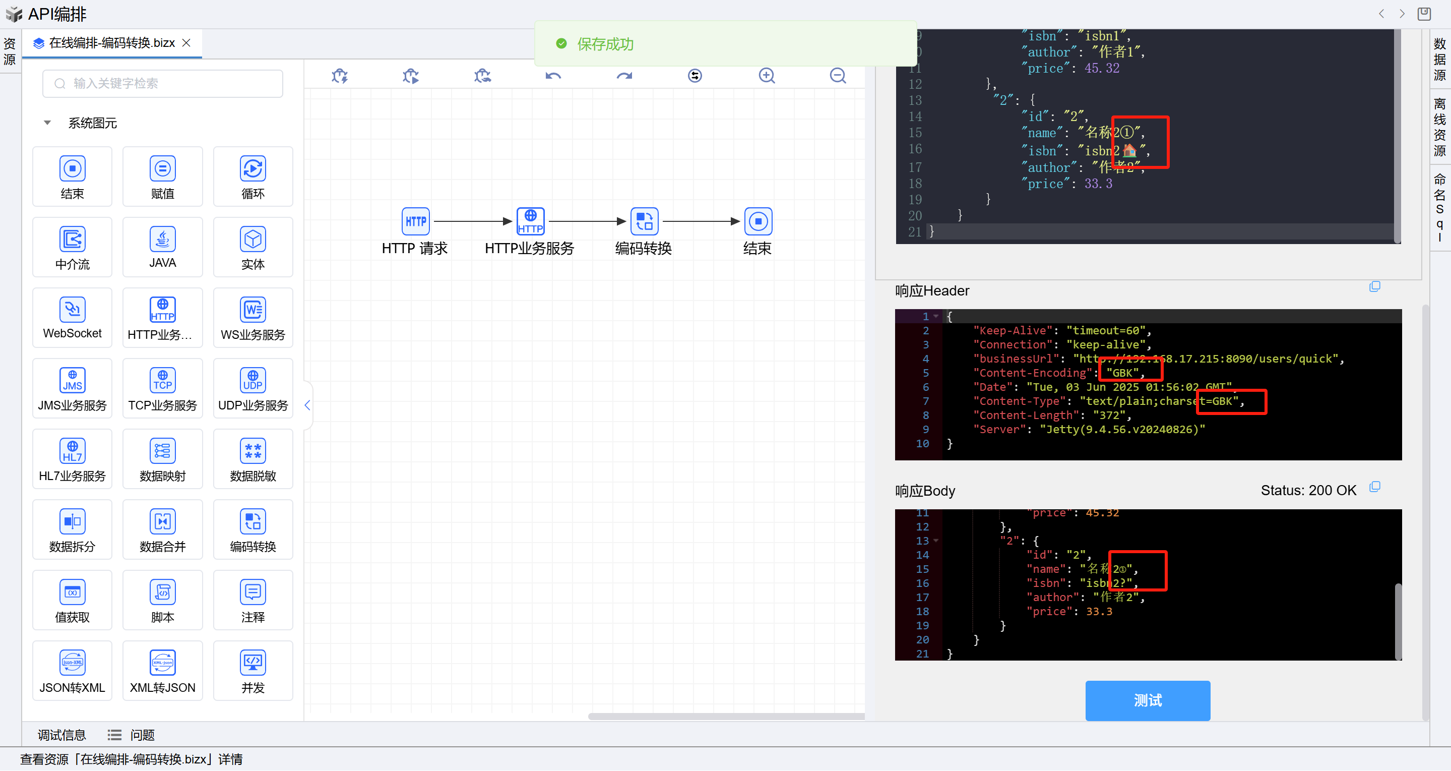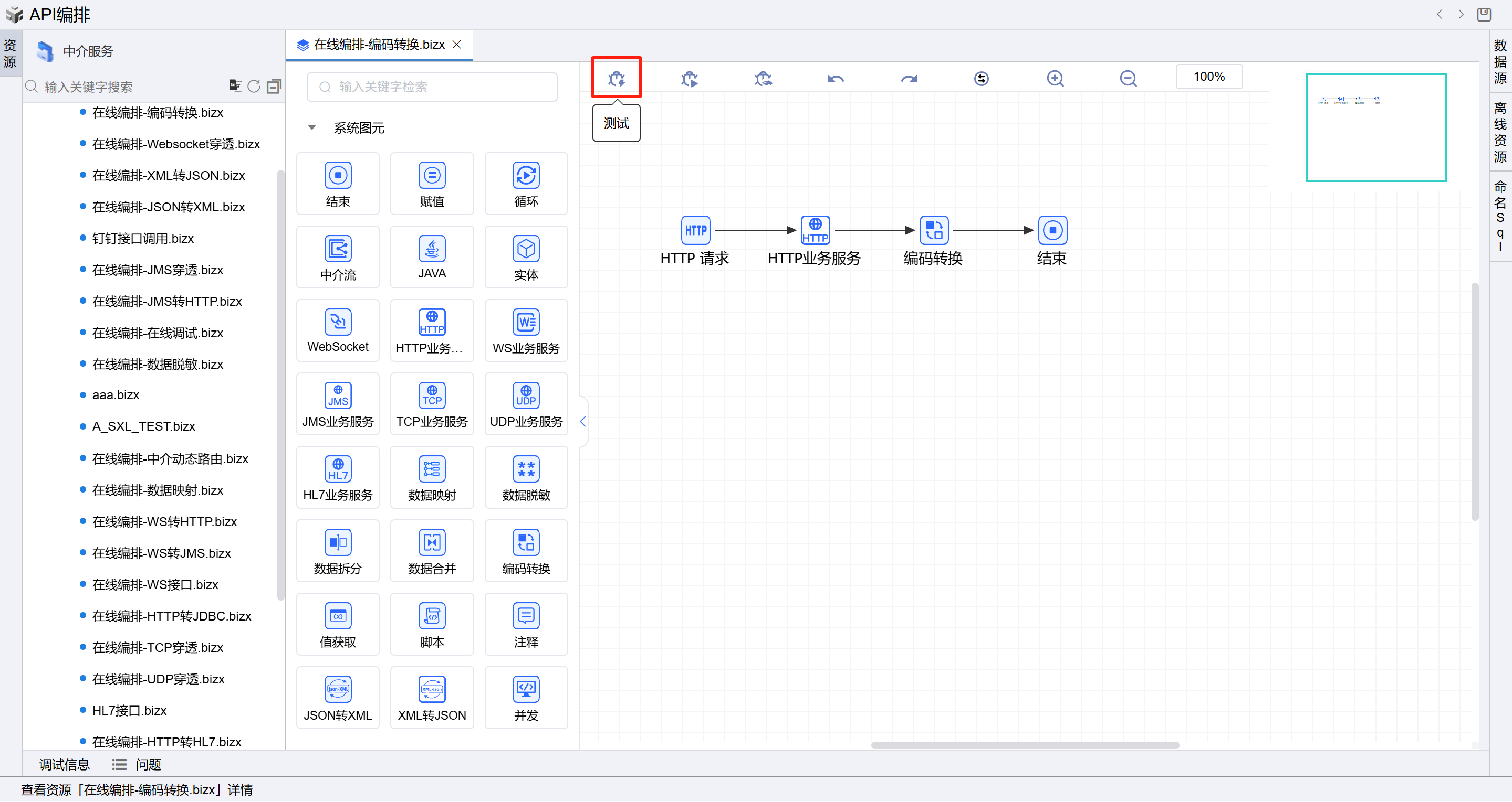 1. 在线编排页面保存成功后,点击界面上方的测试按钮,如下图: