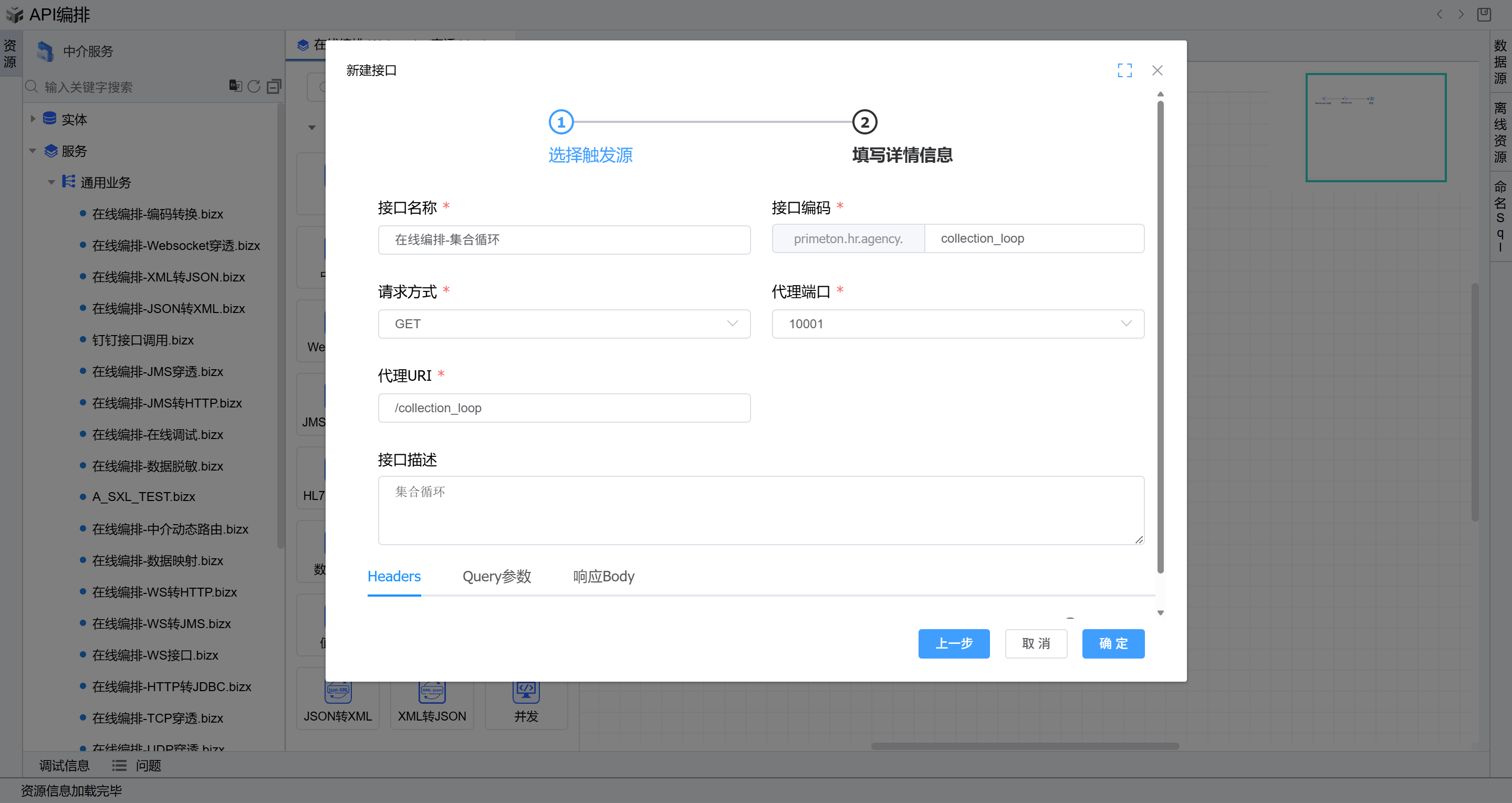 - 在线编排页面中,在通用业务目录上点击右键,点击新建,点击新建HTTP接口,然后如下图所示填写数据,其中代理URI填写符合规则的接口地址,并点击确定保存。
