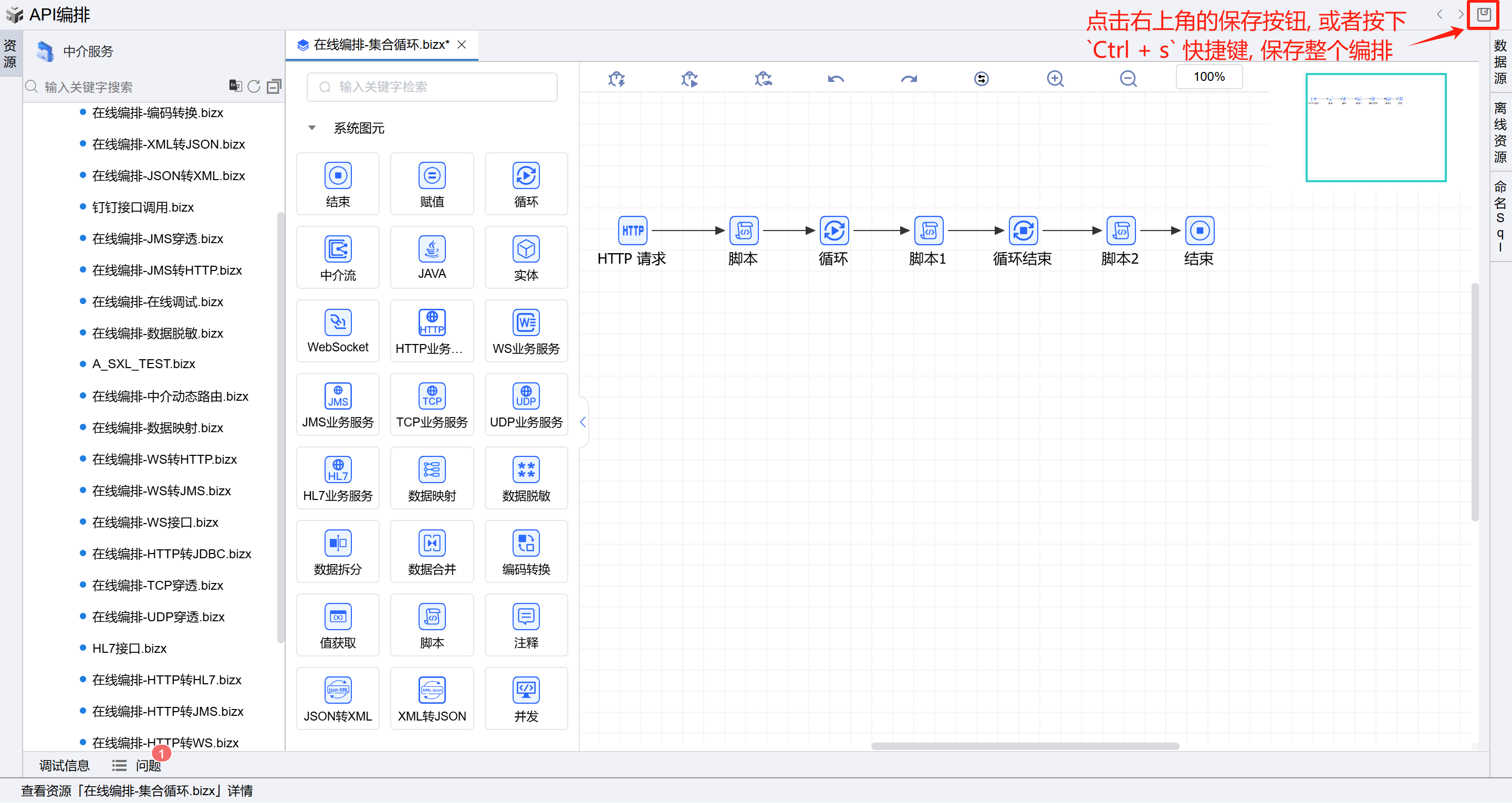 - 1.1. 或者点击中介服务,点击API编排按钮进入在线编排页面。如下图: