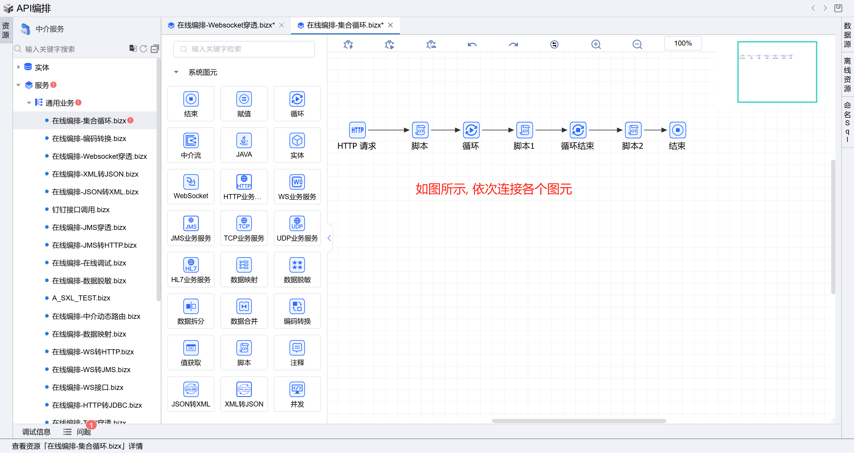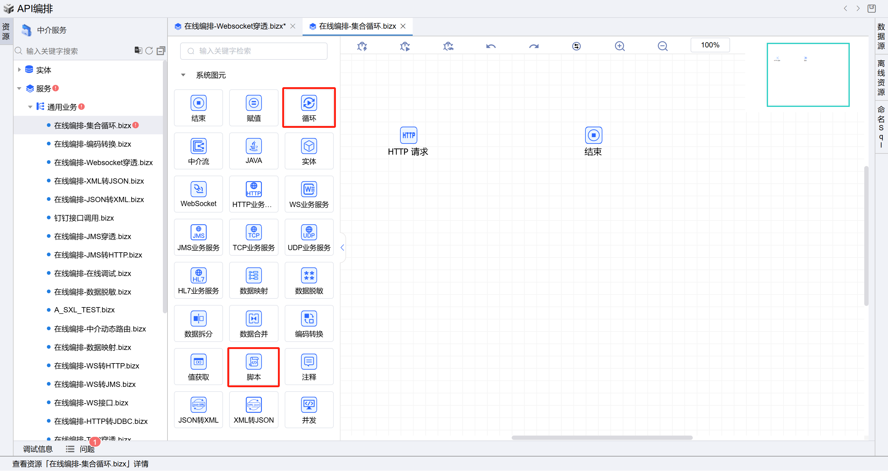 - 保存成功后系统自动打开中介编排页面,如下图所示。从左侧拖一个循环图元(拖过来之后会出现