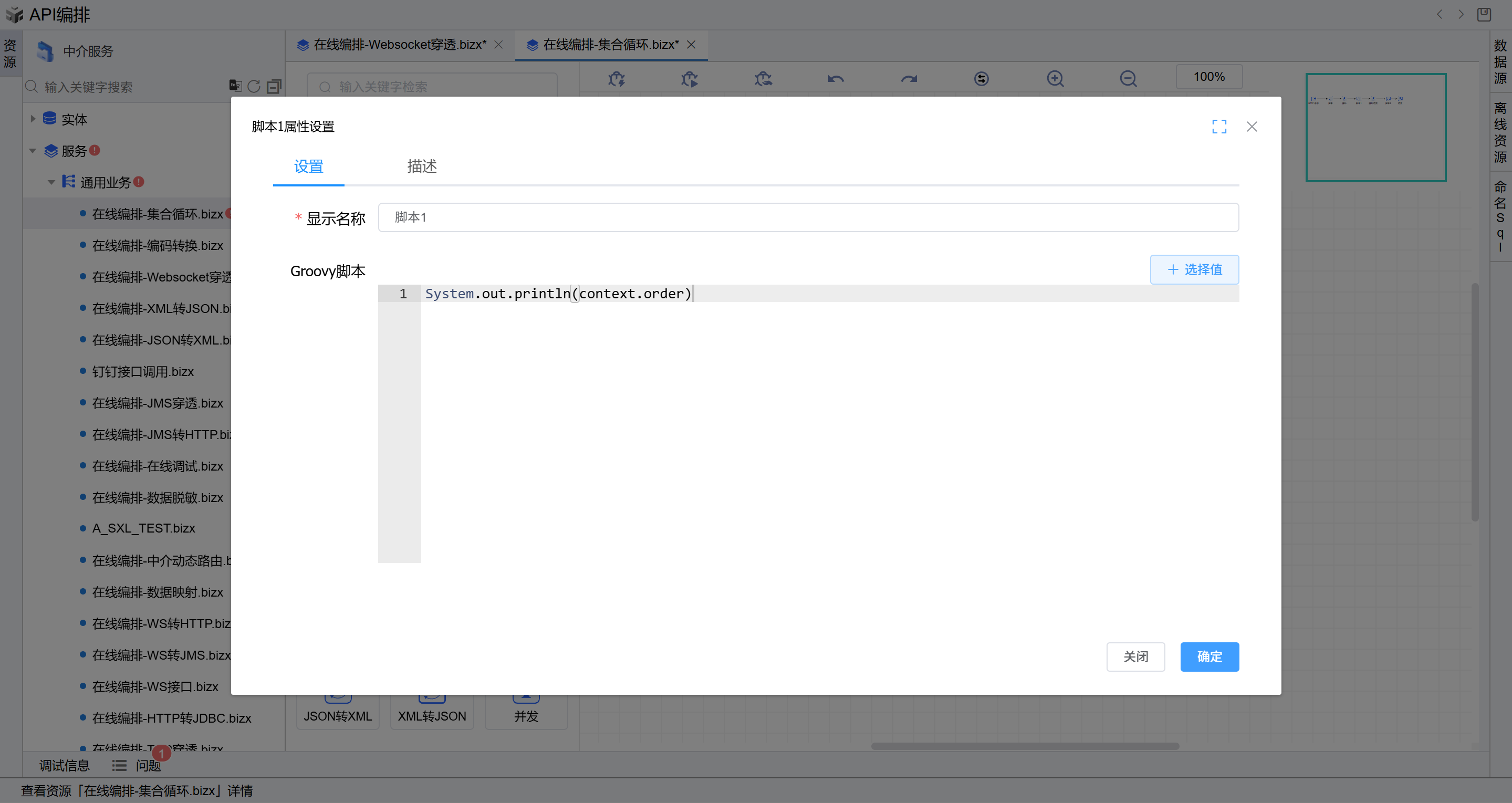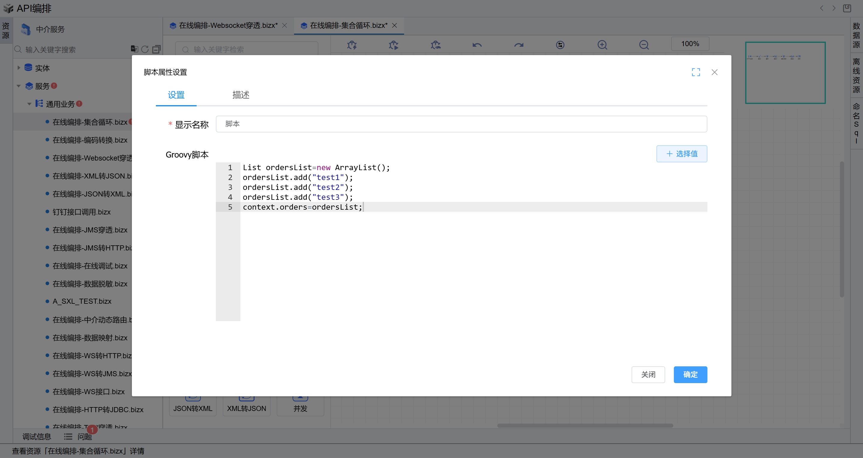 - 双击第一个脚本图元,进入脚本编辑页面,输入如下示例脚本代码(主要用于构造遍历的集合信息),点击“确定”按钮。如下图:
