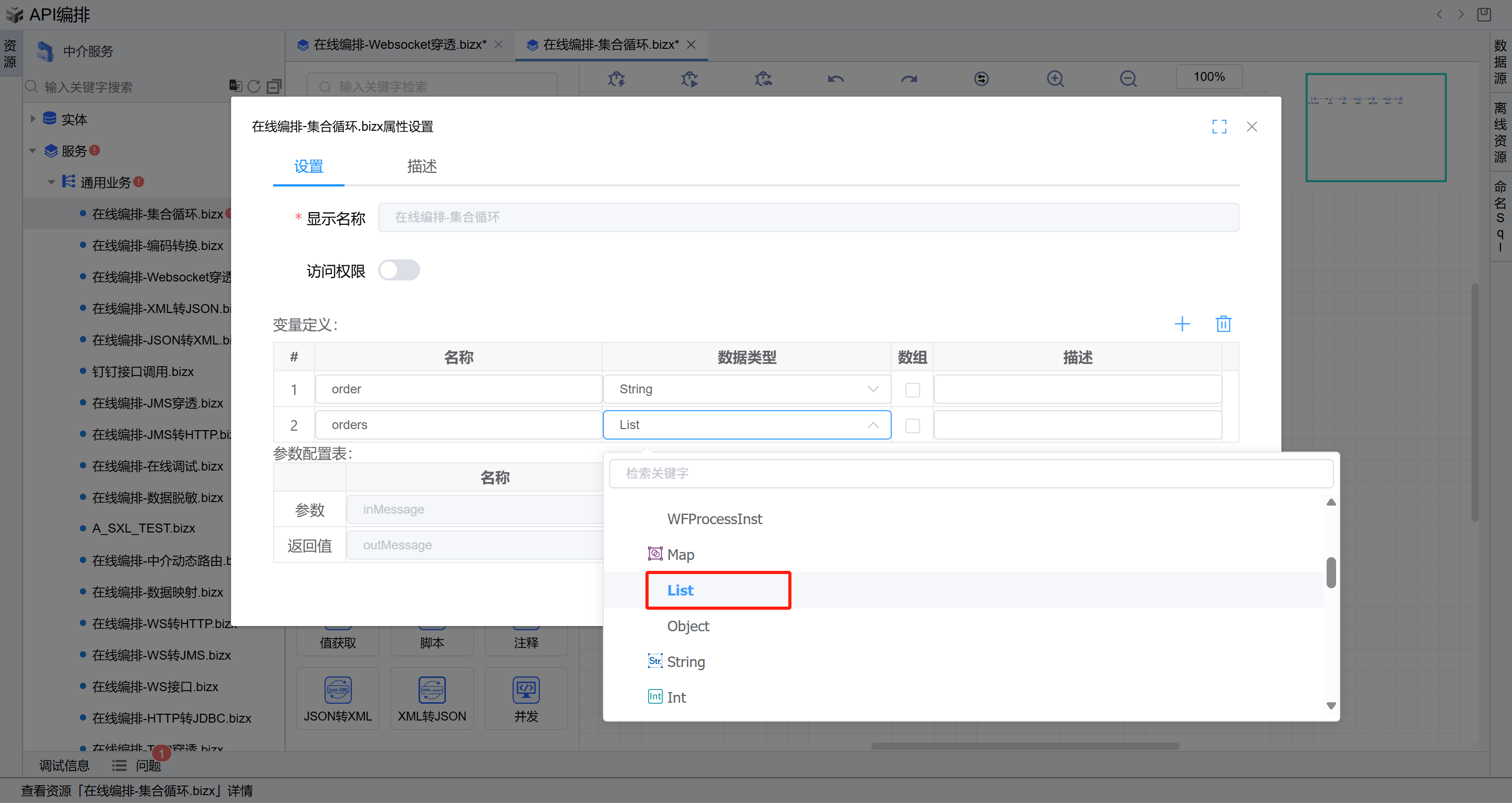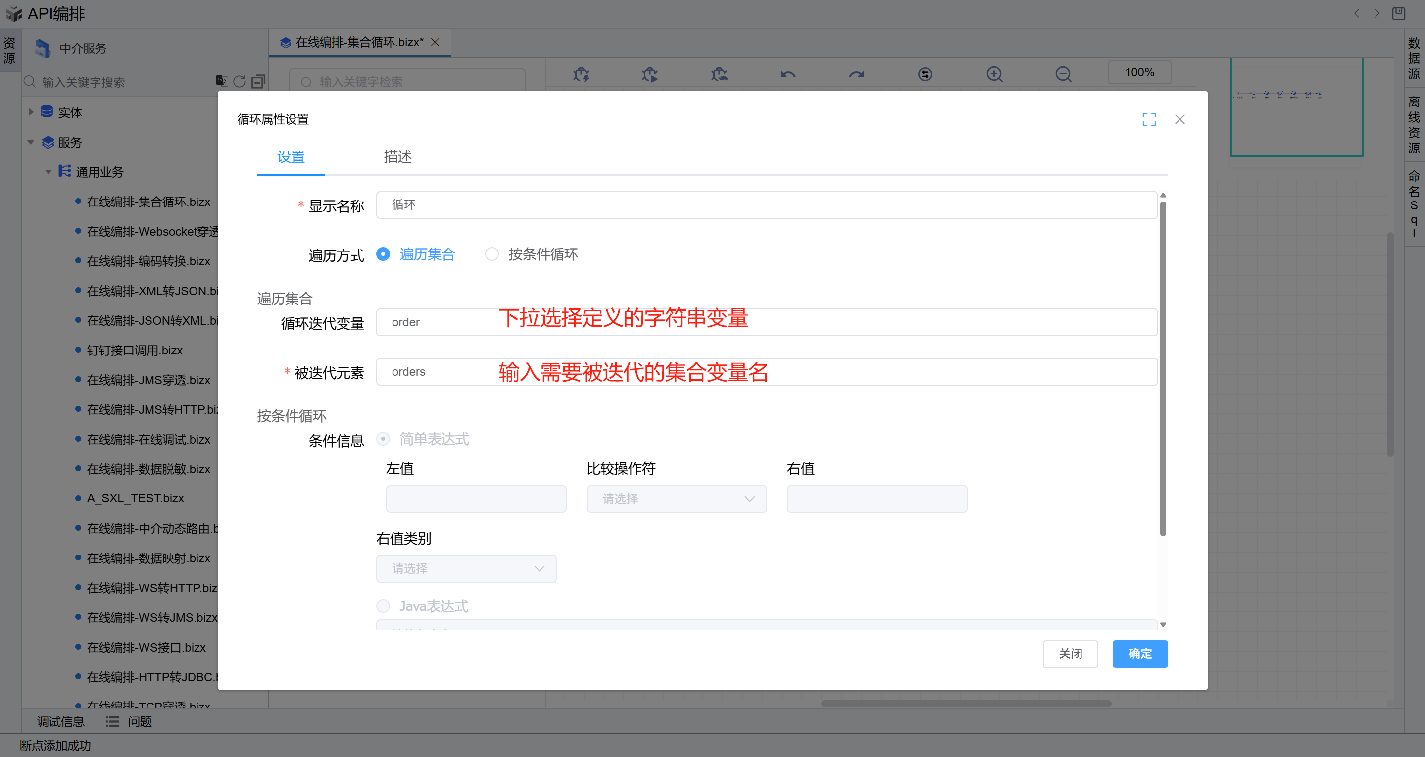 - 双击循环图元,进入属性编辑页面,点击“循环迭代变量”下拉列表,选择新增的列表类型的