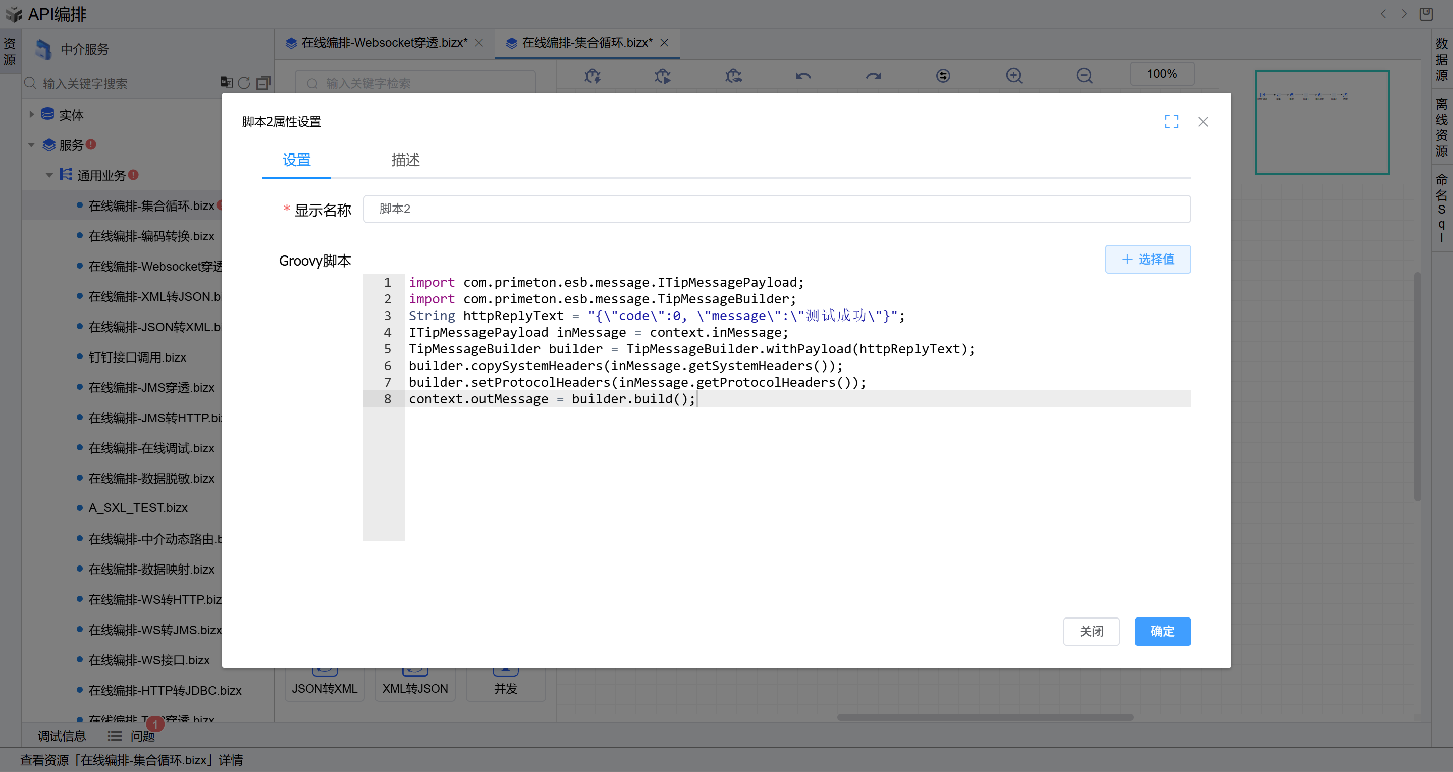 - 双击第三个脚本图元,进入脚本编辑页面,输入如下示例脚本代码(主要用于构造响应信息),点击“确定”按钮。如下图: