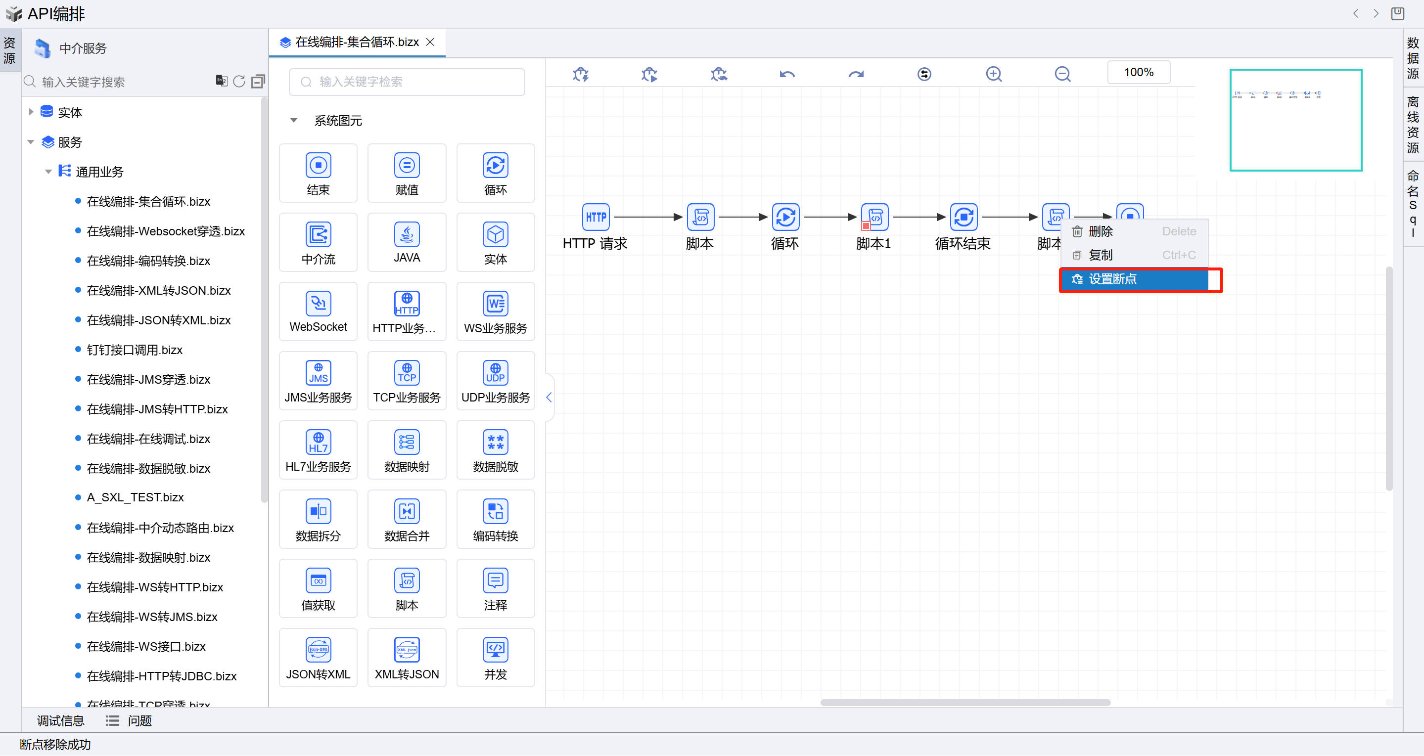 右键点击第二个和第三个脚本图元,选择“设置断点”,如下图: