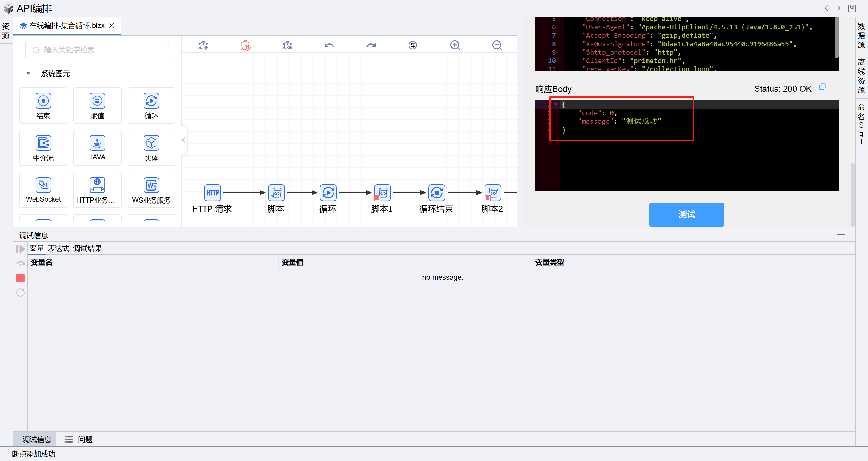 所有断点成功执行后,可看到接口返回第三个脚本构建的响应信息,如下图: