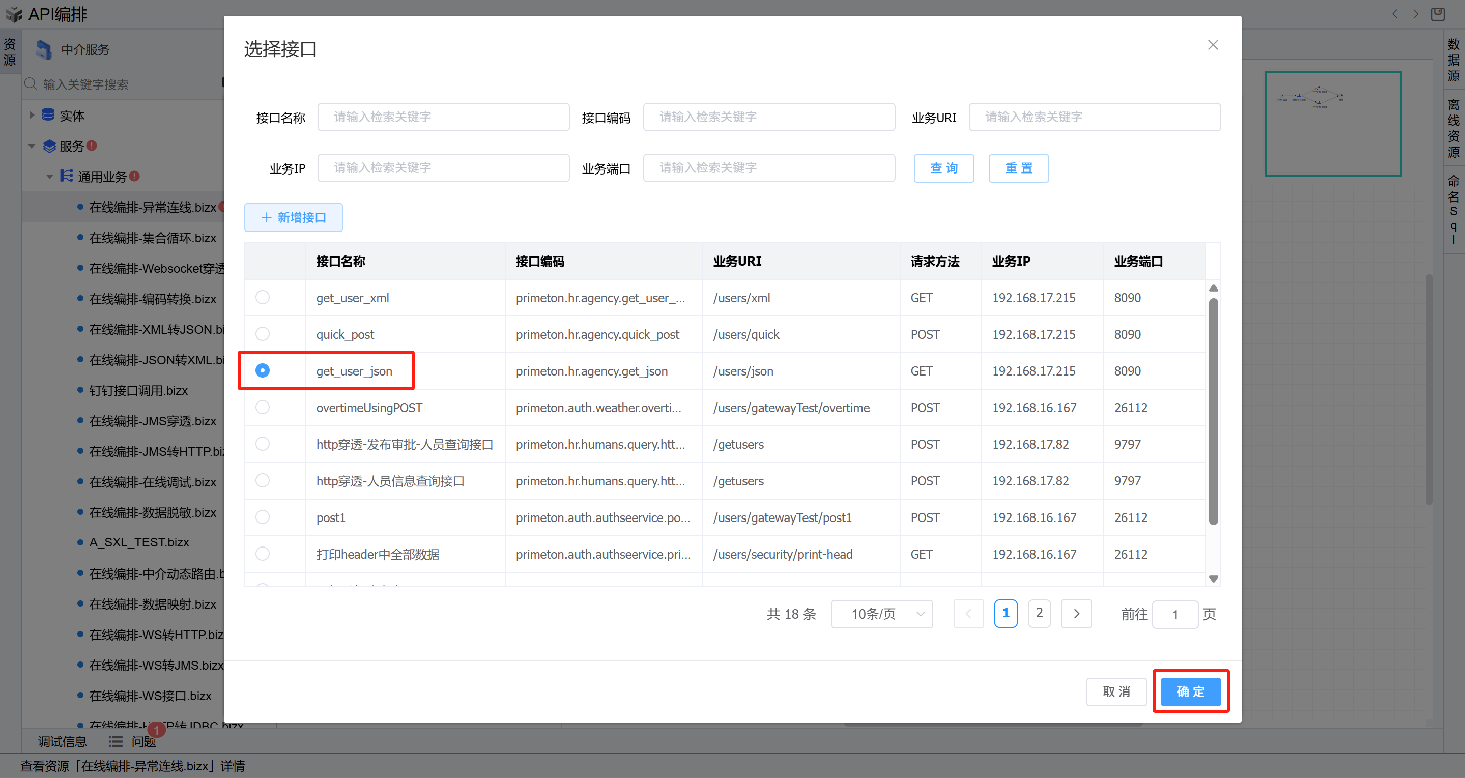 - 双击第一个HTTP业务服务图元,进入编辑页面,在业务接口右侧点击“选择”按钮,进入选择接口页面,选择前置条件中新增的