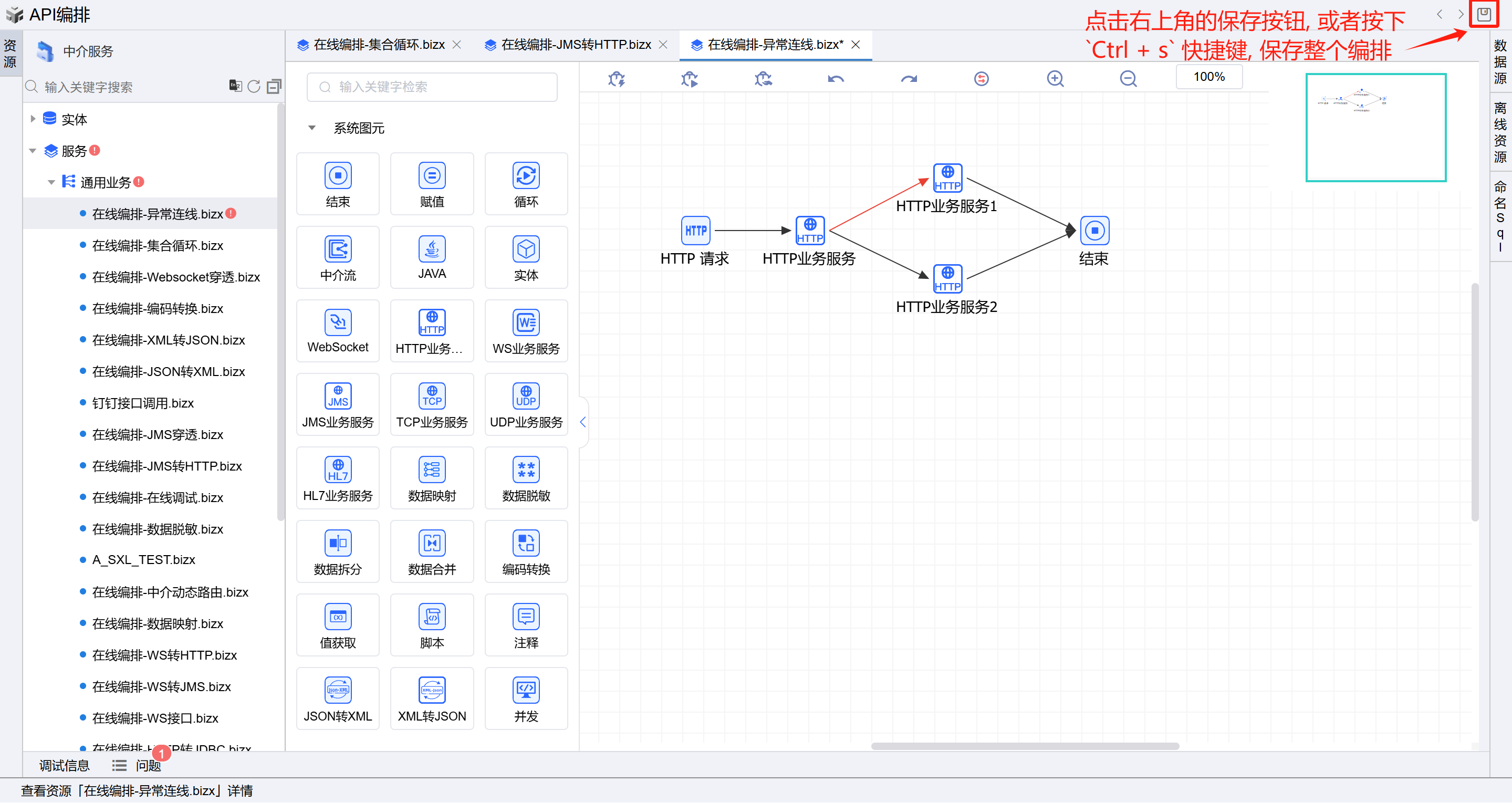 - 1.1. 或者点击中介服务,点击API编排按钮进入在线编排页面。如下图: