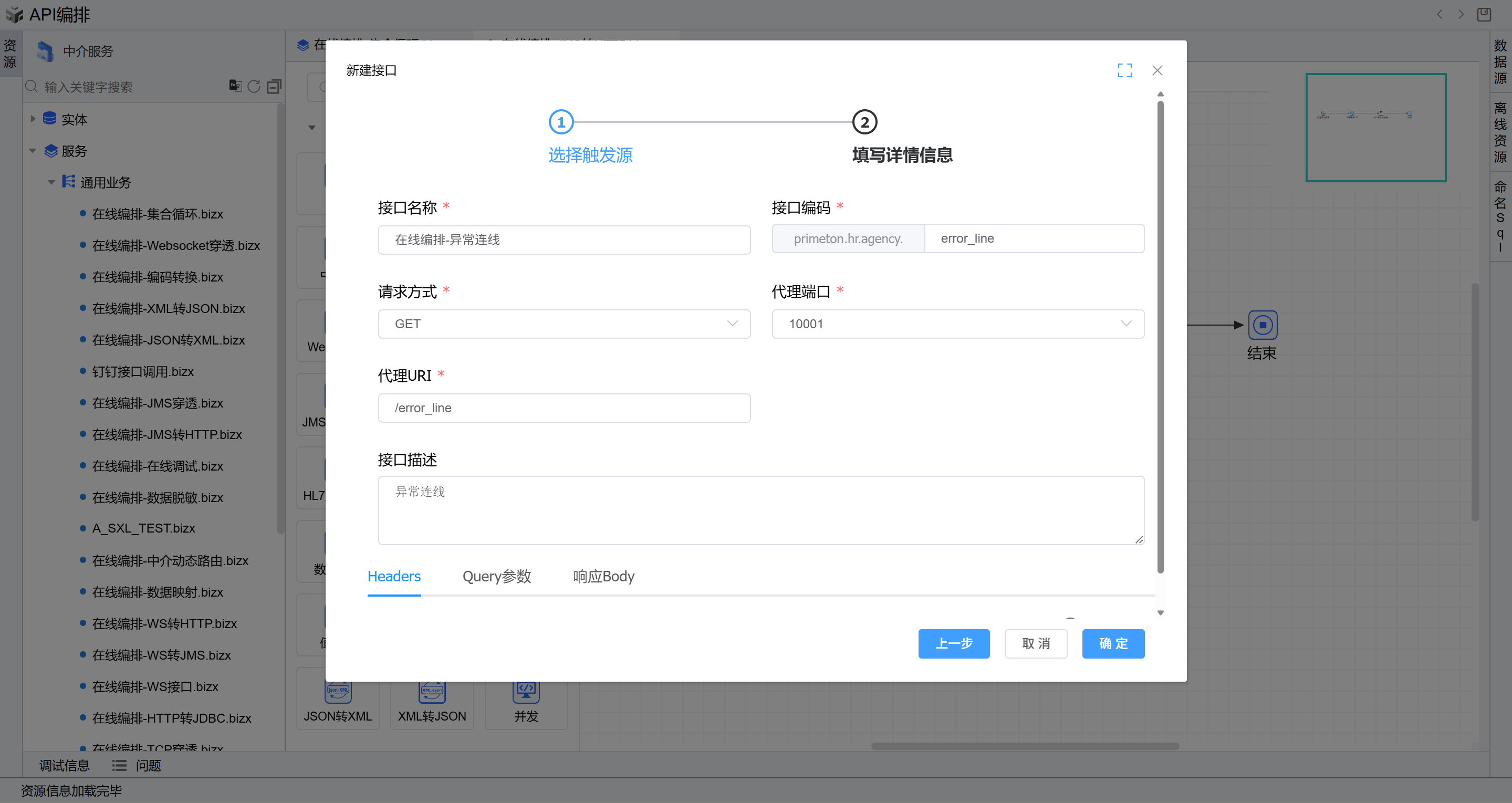 - 双击第二个HTTP业务服务图元(异常线连接的图元),进入编辑页面,在业务接口右侧点击“选择”按钮,进入选择接口页面,选择前置条件中新增的