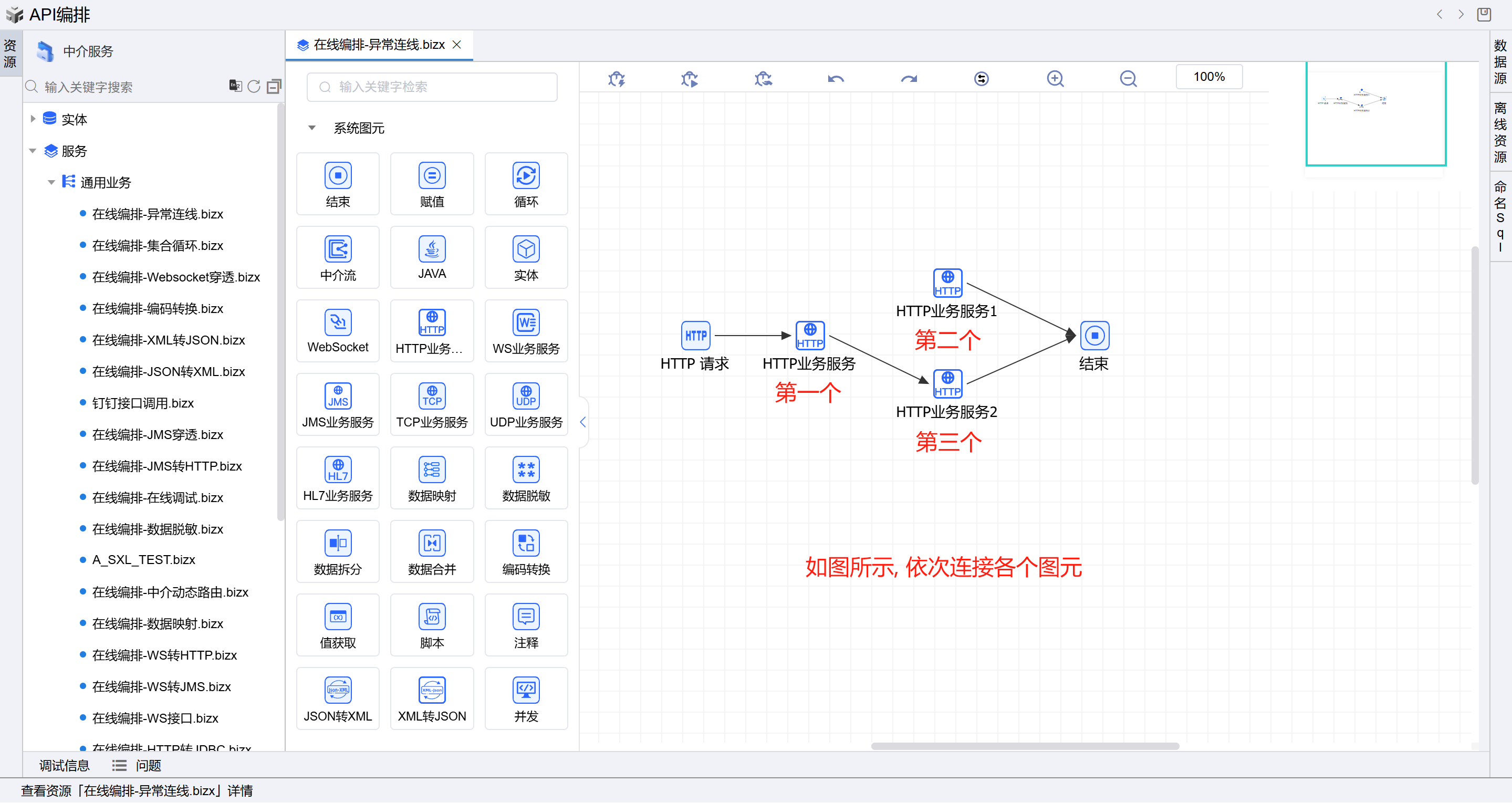 - 保存成功后系统自动打开中介编排页面,如下图所示。从左侧拖三个HTTP业务服务图元(顺序如下图所示)到开始和结束图元中间并依次连接各个图元。如下图: