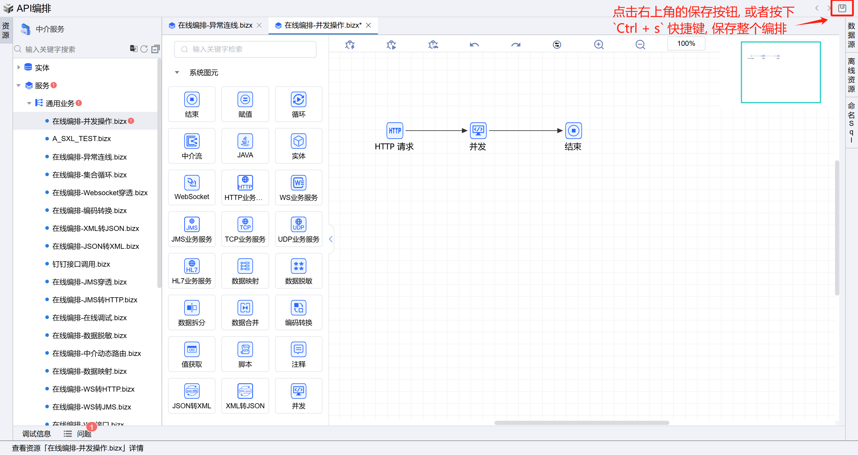 - 1.1. 或者点击中介服务,点击API编排按钮进入在线编排页面。如下图: