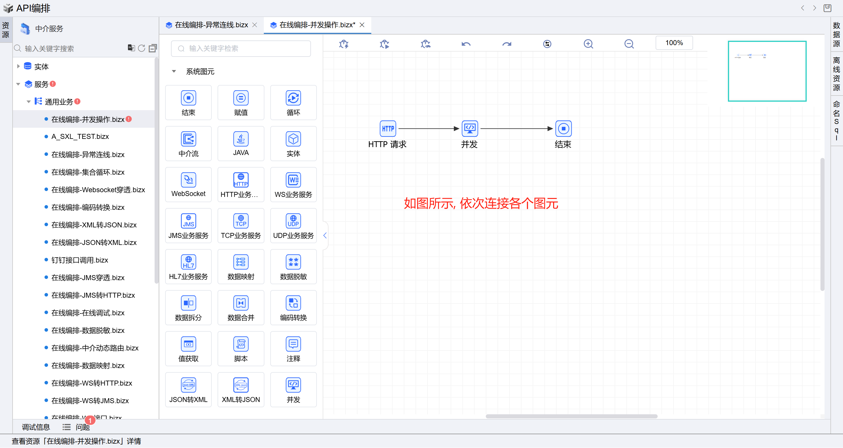 - 保存成功后系统自动打开中介编排页面,如下图所示。从左侧拖一个并发图元到开始和结束图元中间并依次连接各个图元。如下图: