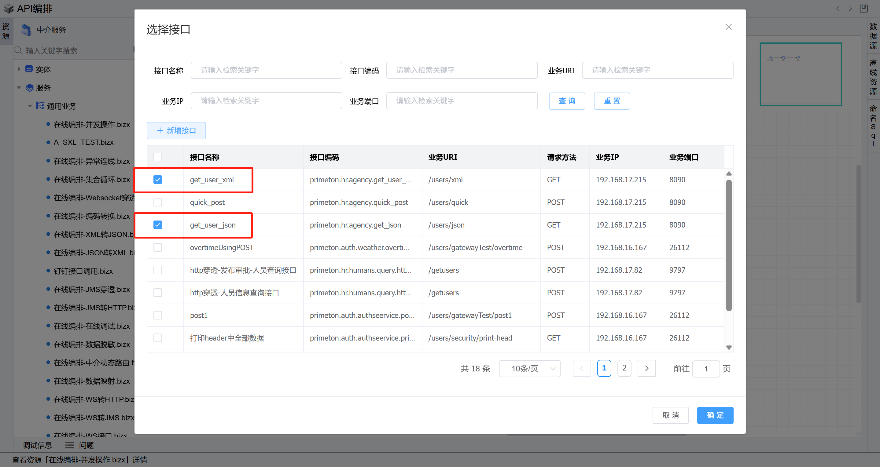 - 双击并发图元,进入编辑页面,在业务接口右侧点击“选择”按钮,进入选择接口页面,选择前置条件中新增的