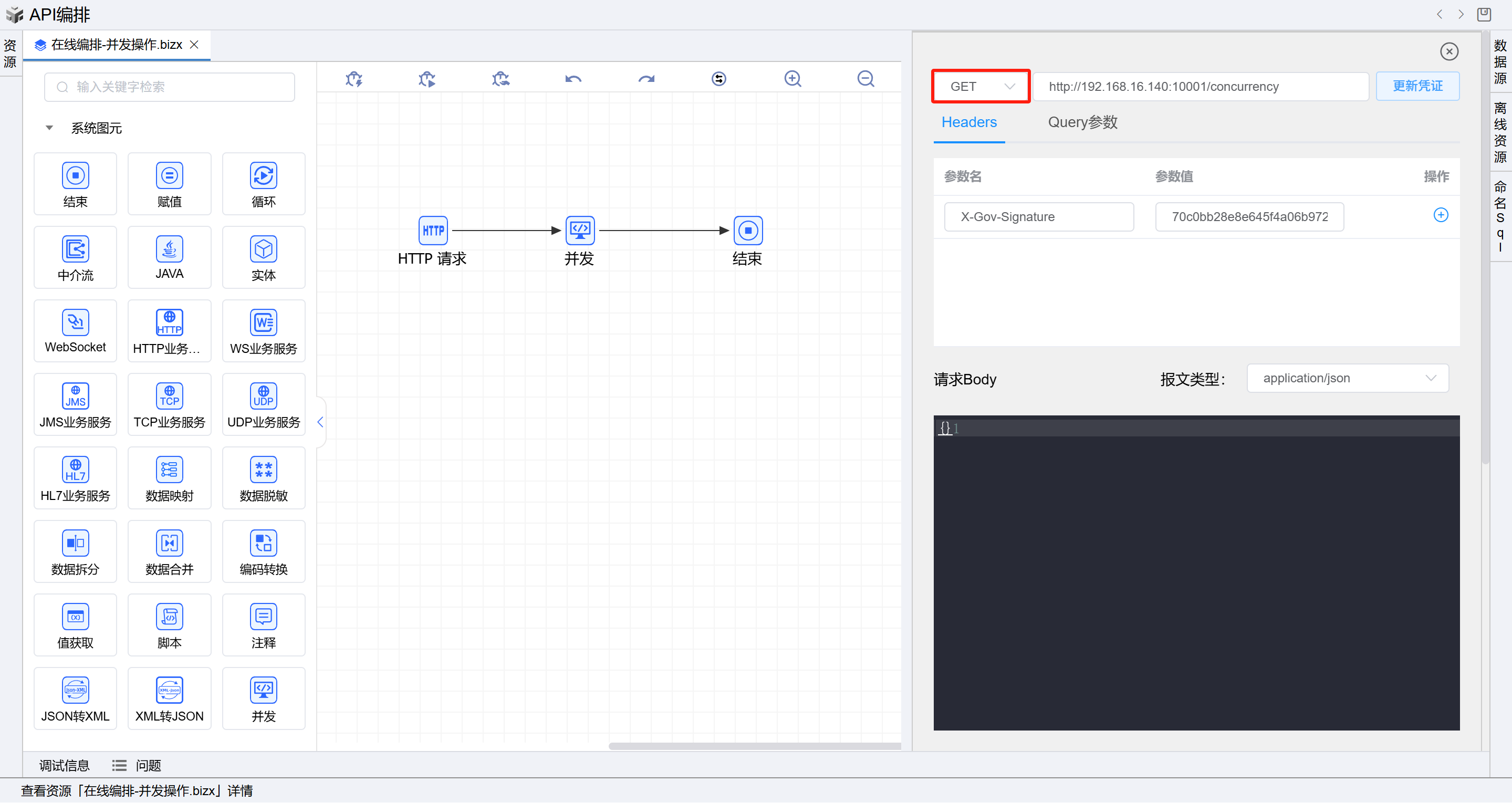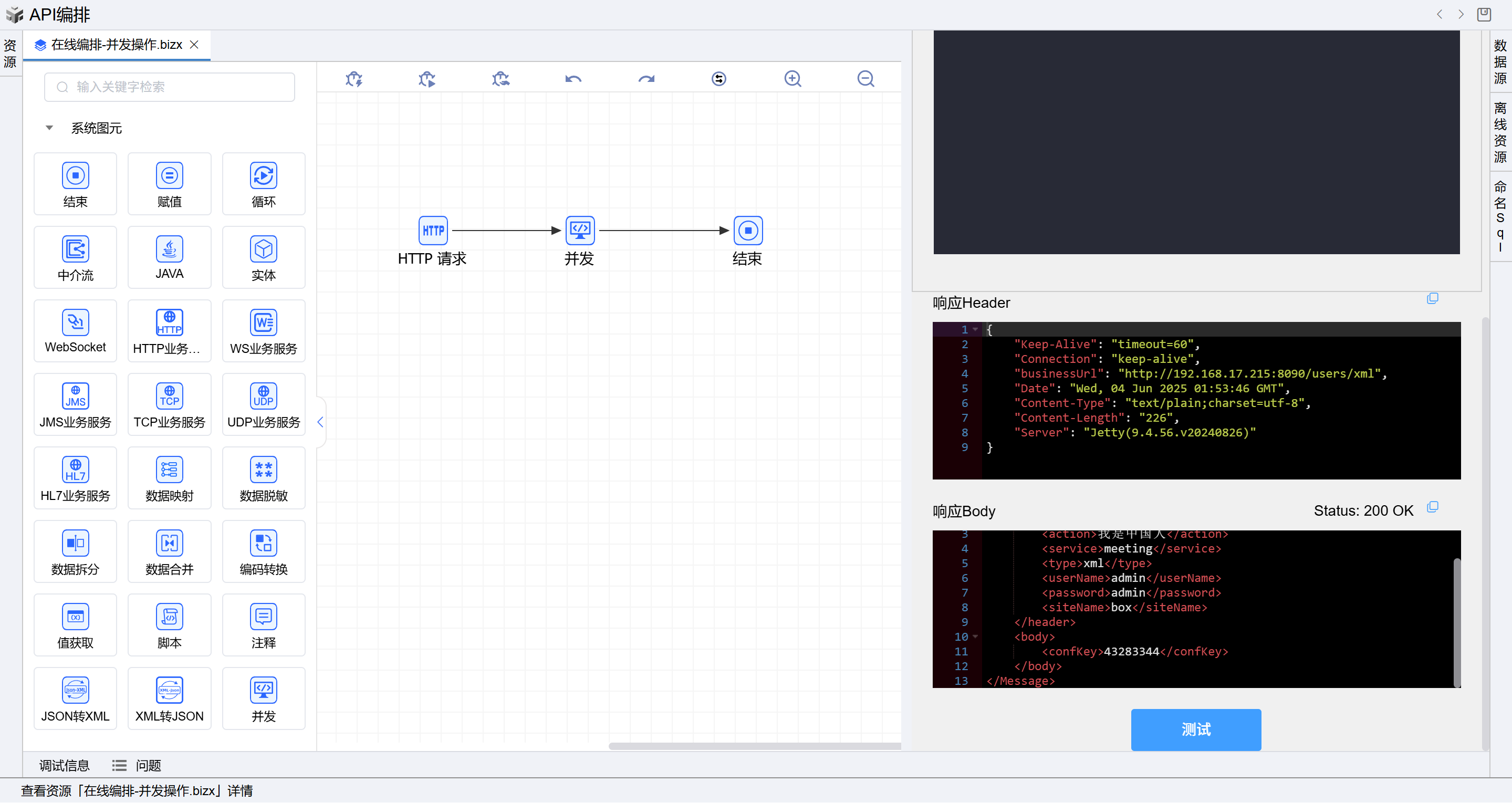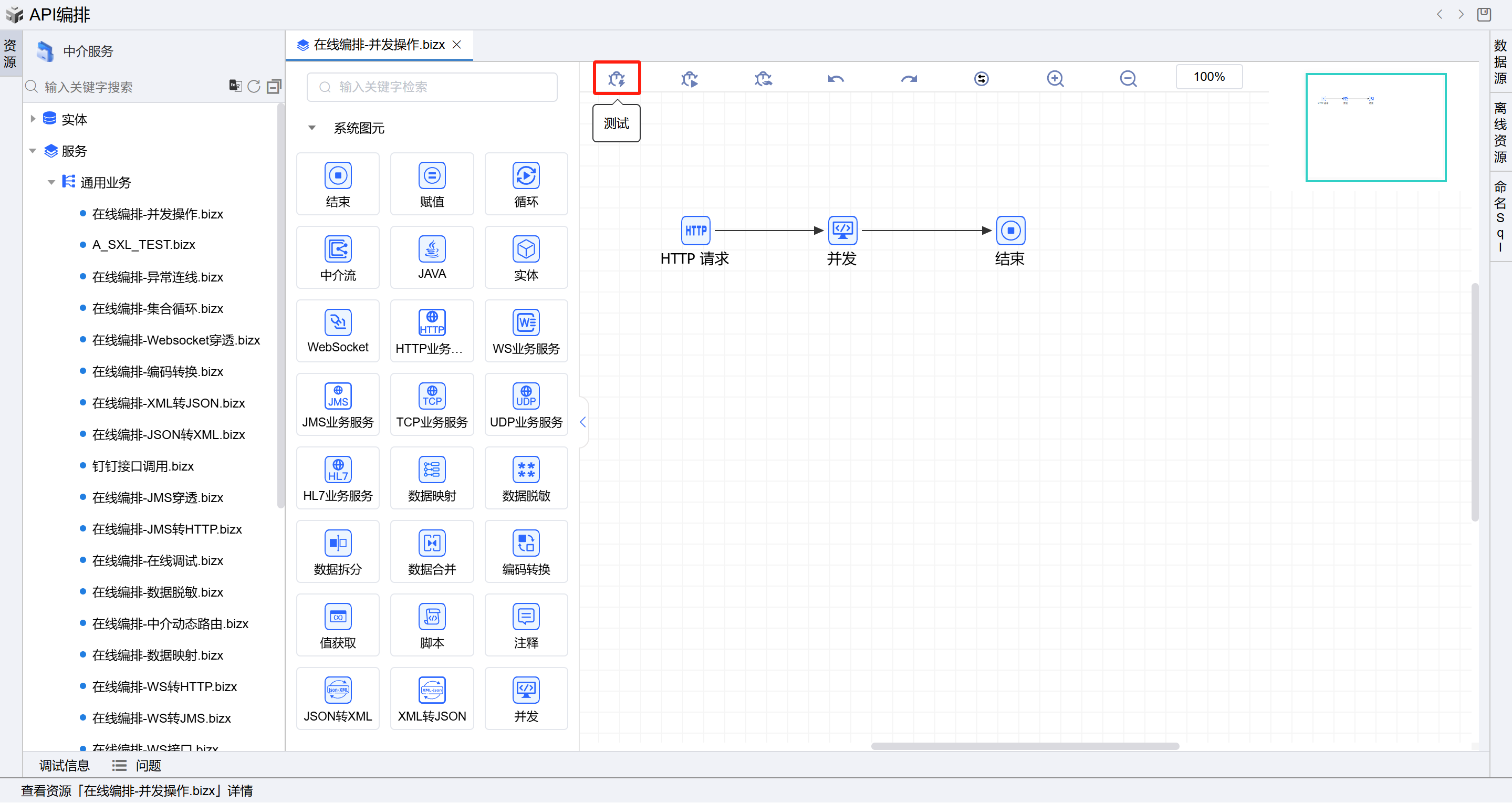 1. 在线编排页面保存成功后,点击界面上方的测试按钮,如下图: