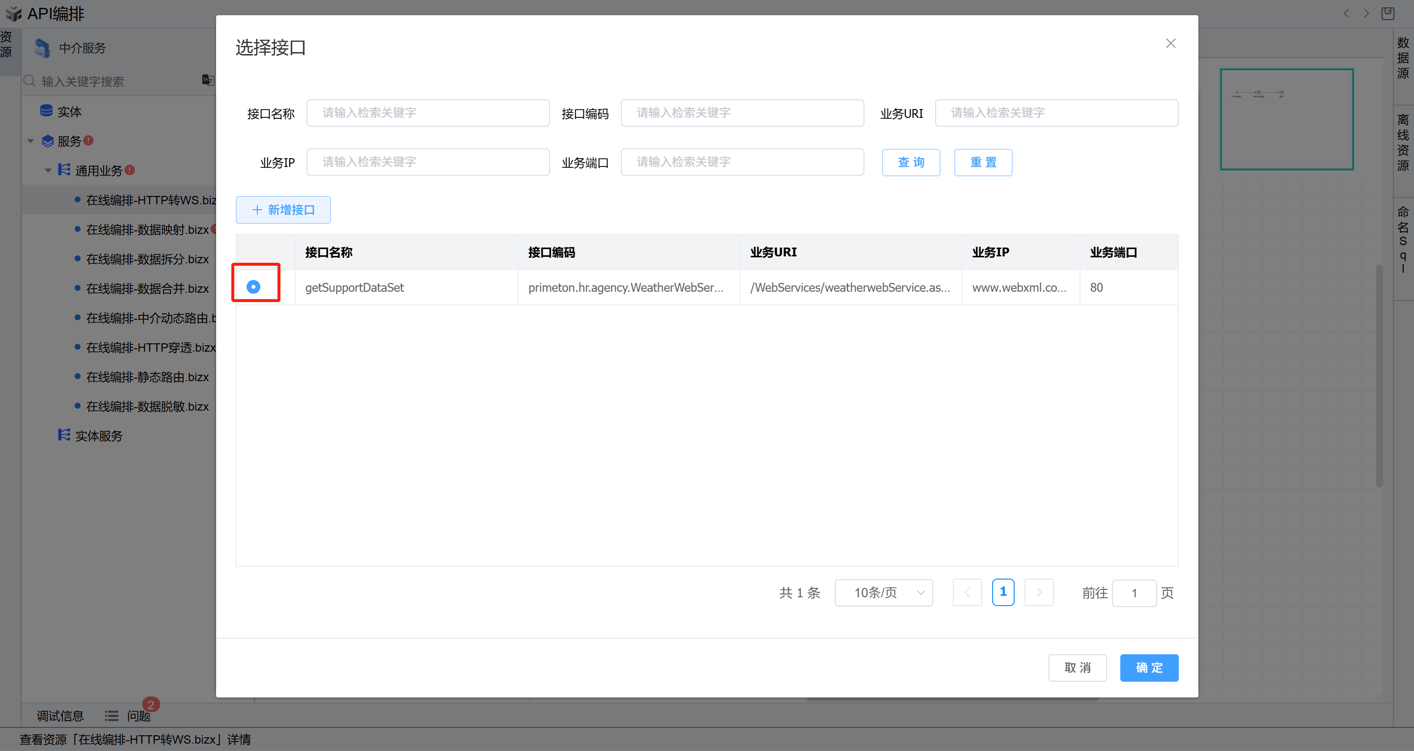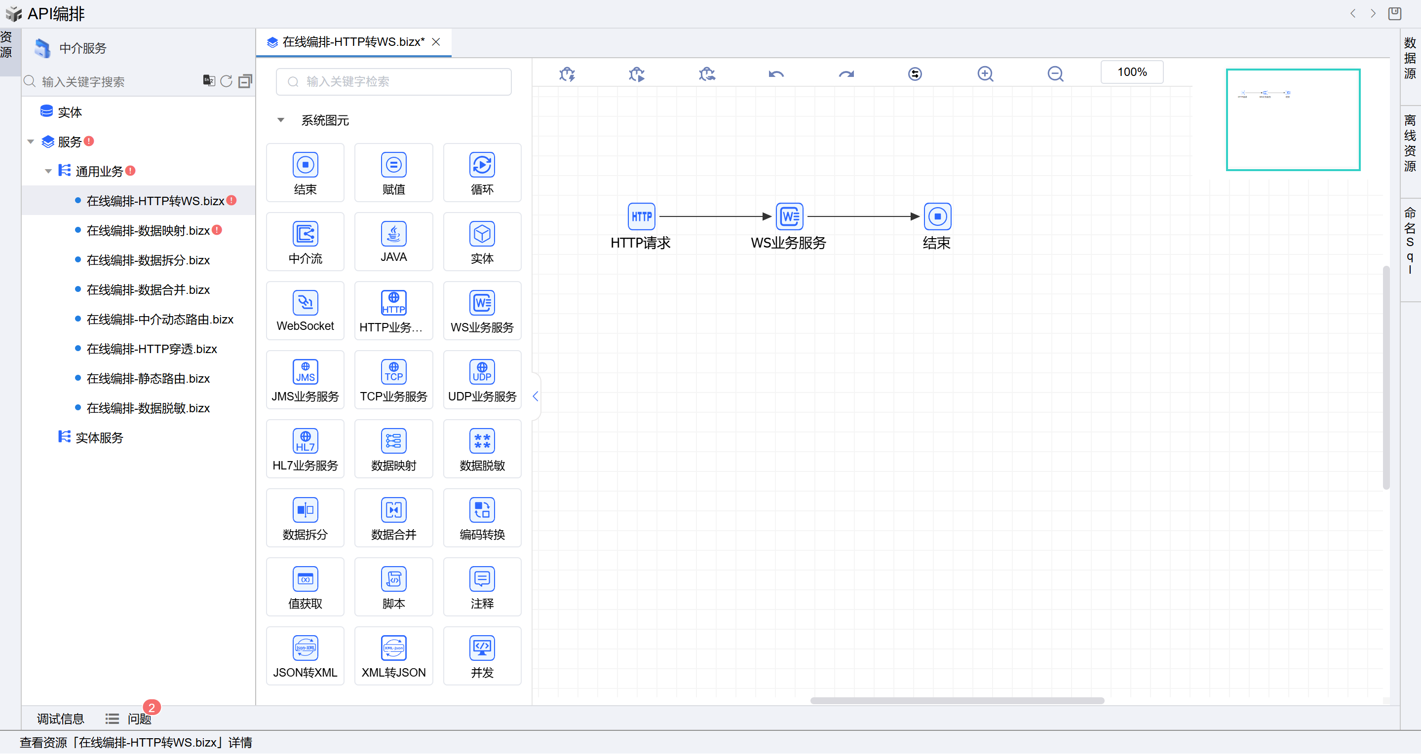 选择左侧树上中介服务节点,点击API创建按钮,选择右侧的”API编排“页签,点击”API编排“按钮,进入在线编排页面。