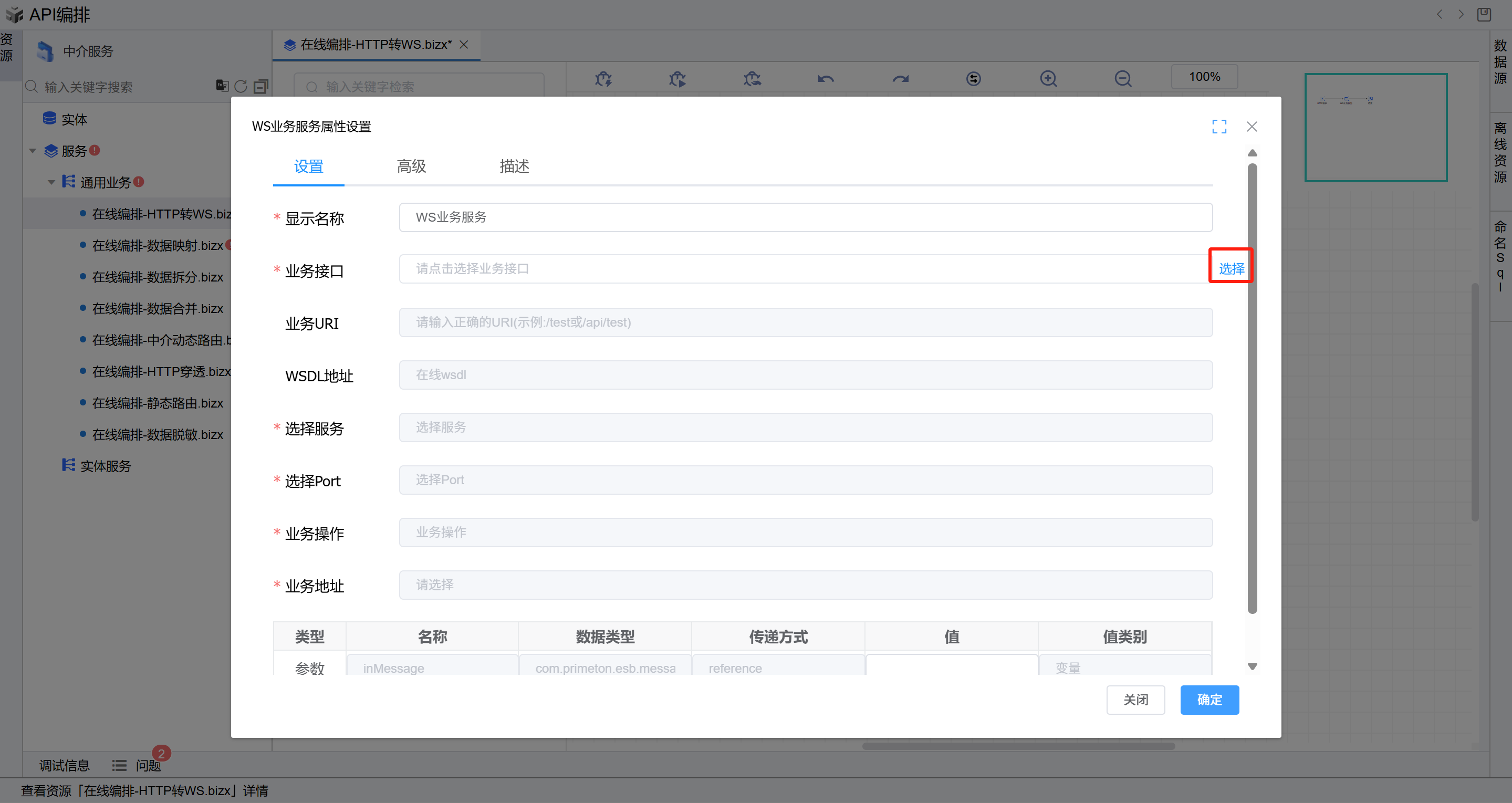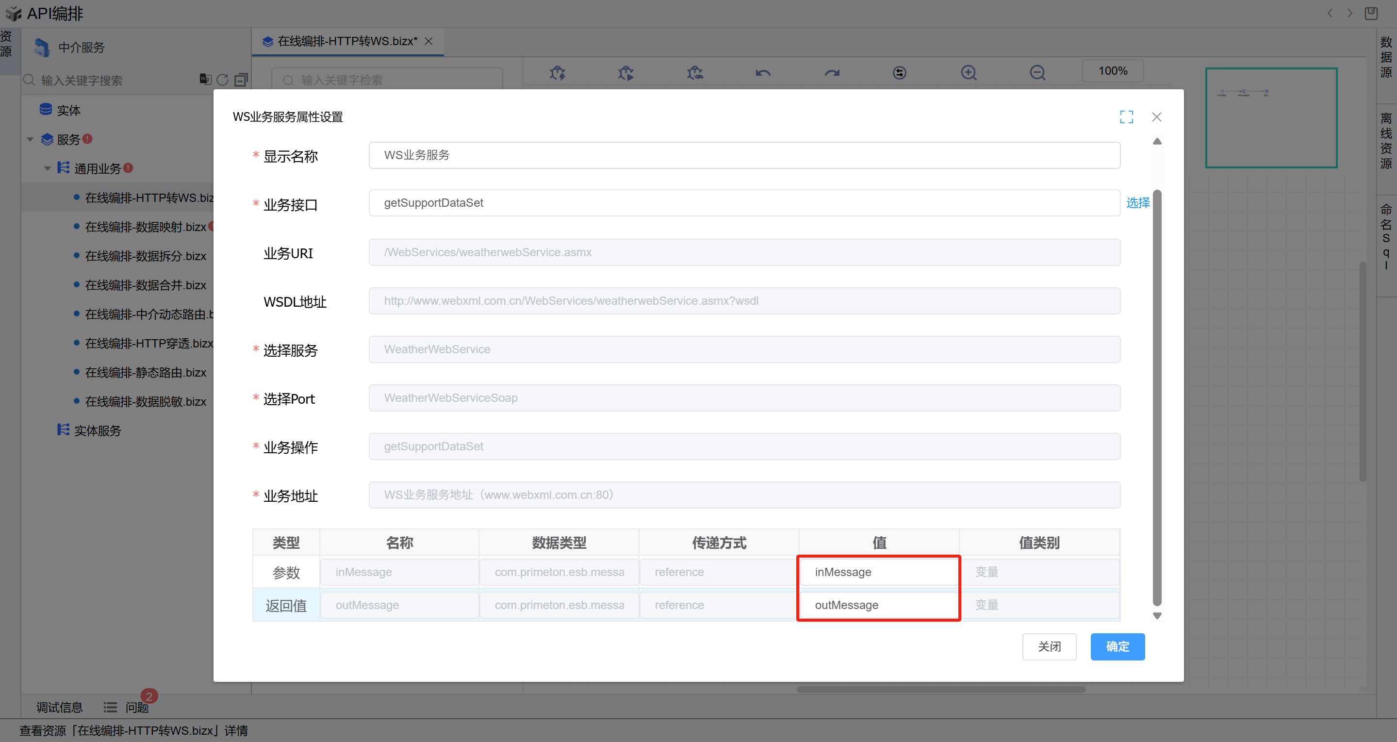 双击打开WS业务服务图元,业务接口点击右侧选择按钮,在弹出的页面中选择我们在wsdl导入时导入的接口,下方表格中的参数和返回值分别选择inMessage和outMessage,然后点击确定按钮关闭对话框。如下图:
