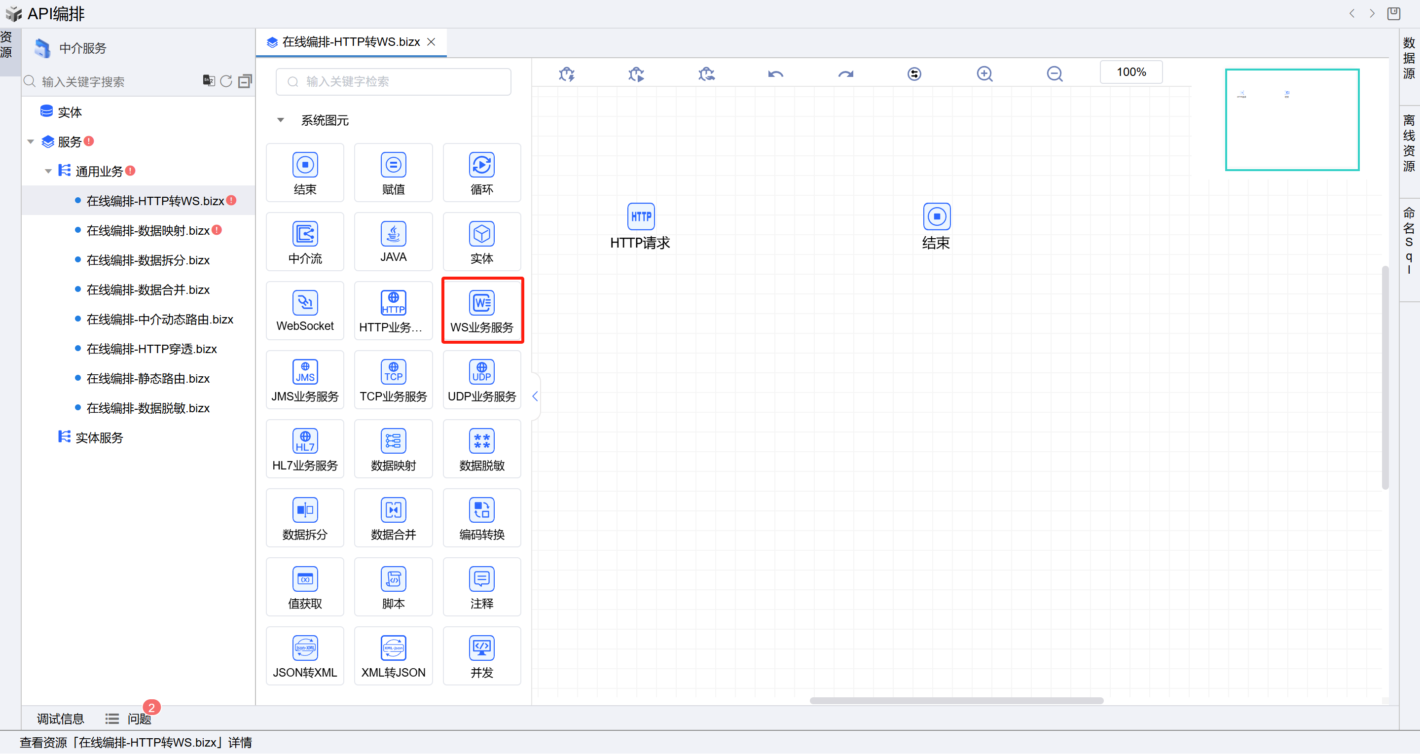 保存成功后,系统自动打开中介编排页面,如下图所示。从左侧拖一个WS业务服务图元到开始和结束图元中间,并依次连接各个图元。如下图: