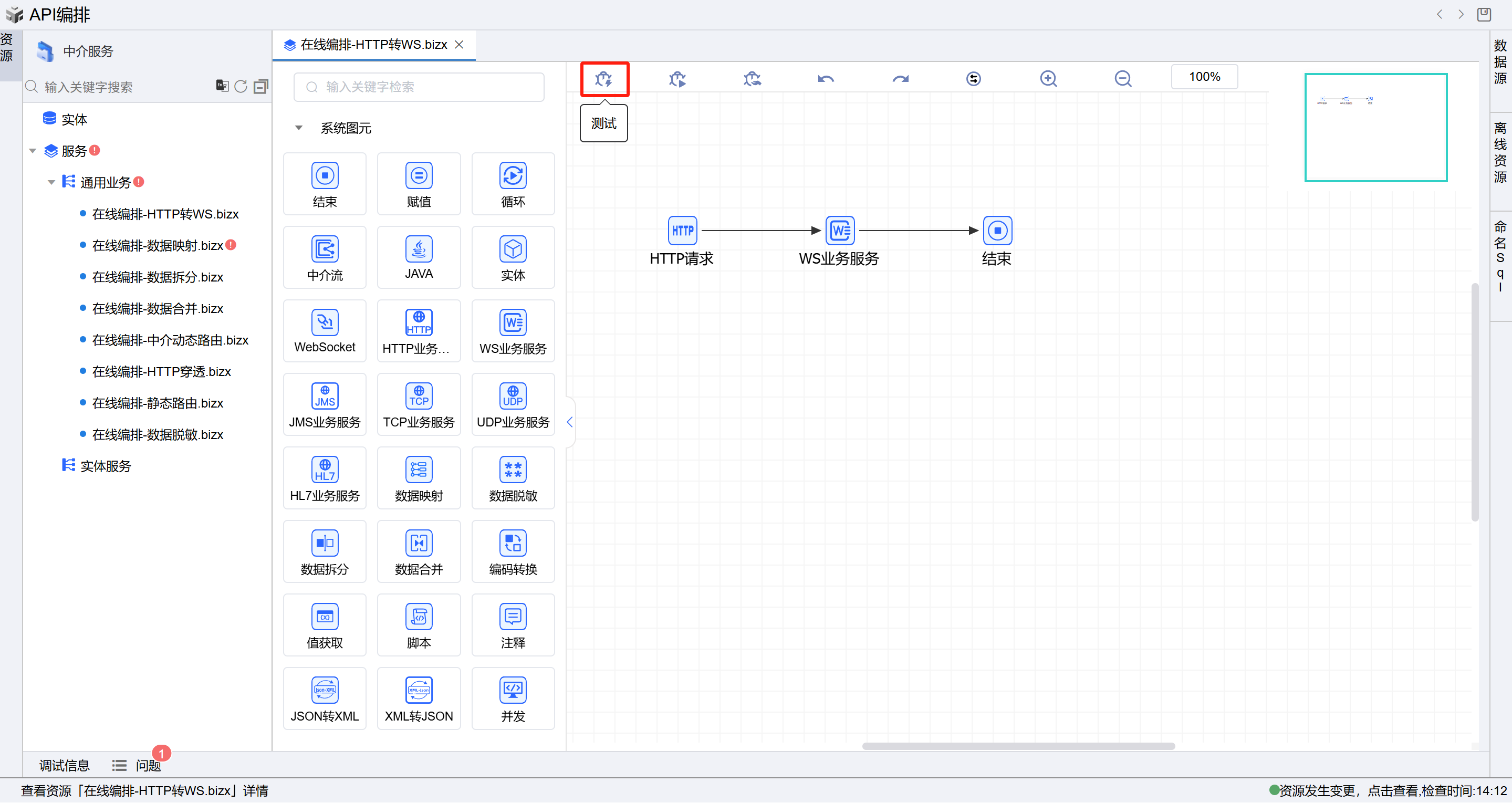 在线编排页面保存成功后,点击界面上方的测试按钮,如下图: