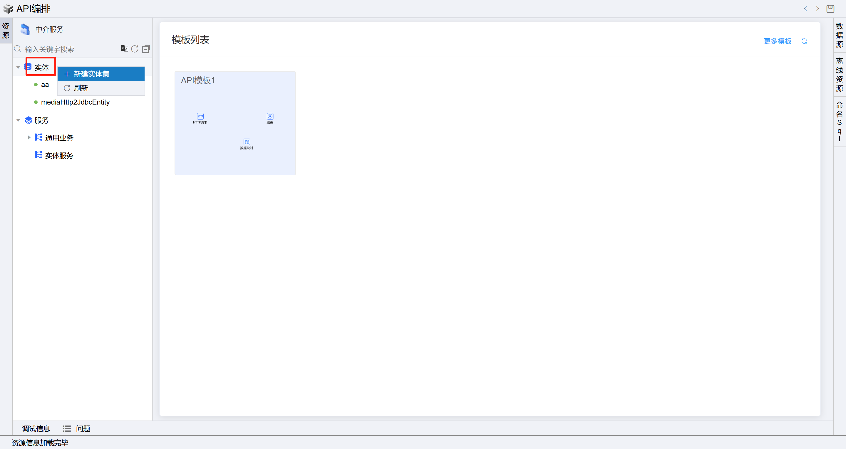 - 在编排页面中,在”实体”目录上点击右键,点击”新建实体集“,进入实体创建页面。