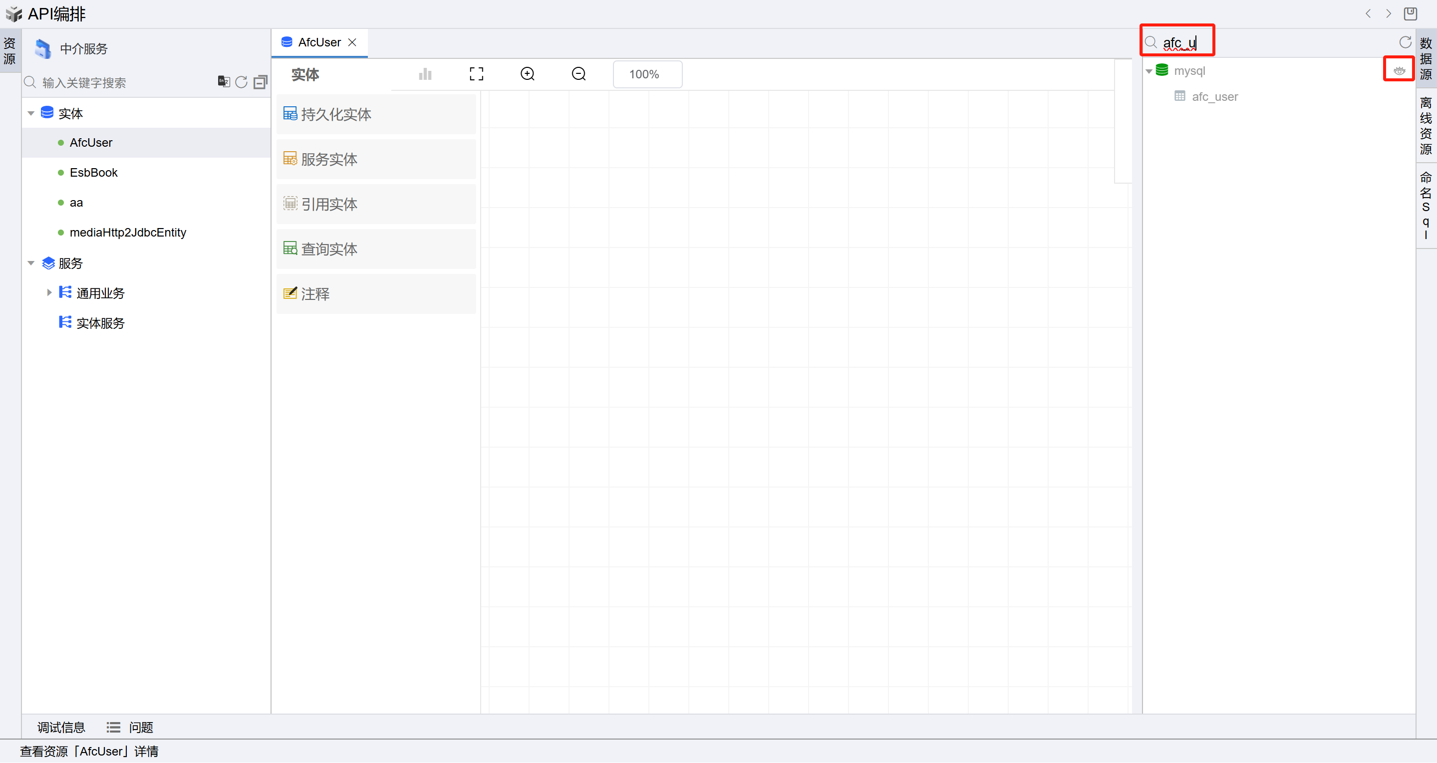 afc_user关键字,找到afc_user表,拖动afc_user表到画布上。