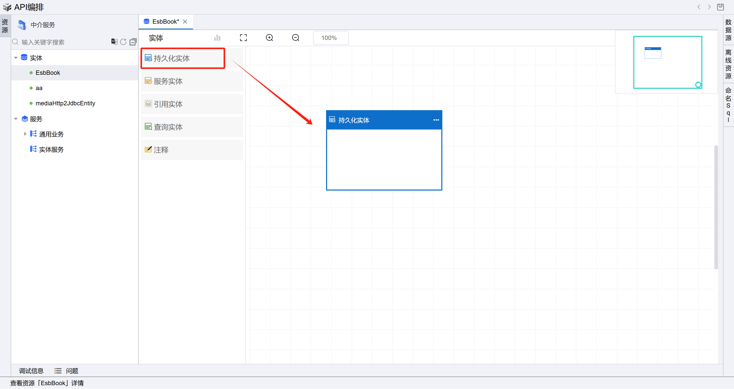 - 在实体创建页面中,从左侧拖动”持久化实体“到画布上。如下图: