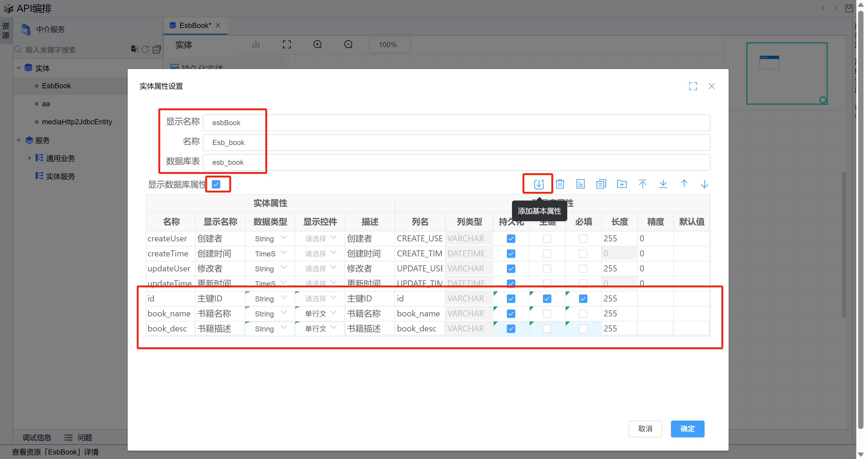 实体名称)、”数据库表”(表名称),点击”显示数据库属性“复选框可查看字段的数据库属性,点击”添加基本信息“按钮, 可新增字段。这里作为演示,添加了三个字段:主键id、字段book_name、字段book_desc。如下图: