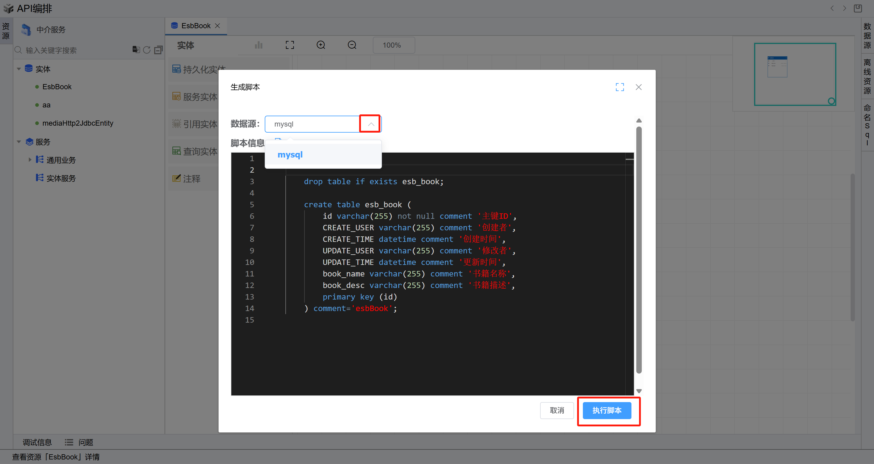 - 在左侧“实体”目录下,找到刚刚创建的实体集,点击右键,选择”生成表“,检查数据源和sql脚本,点击”执行脚本“按钮,生成表成功。