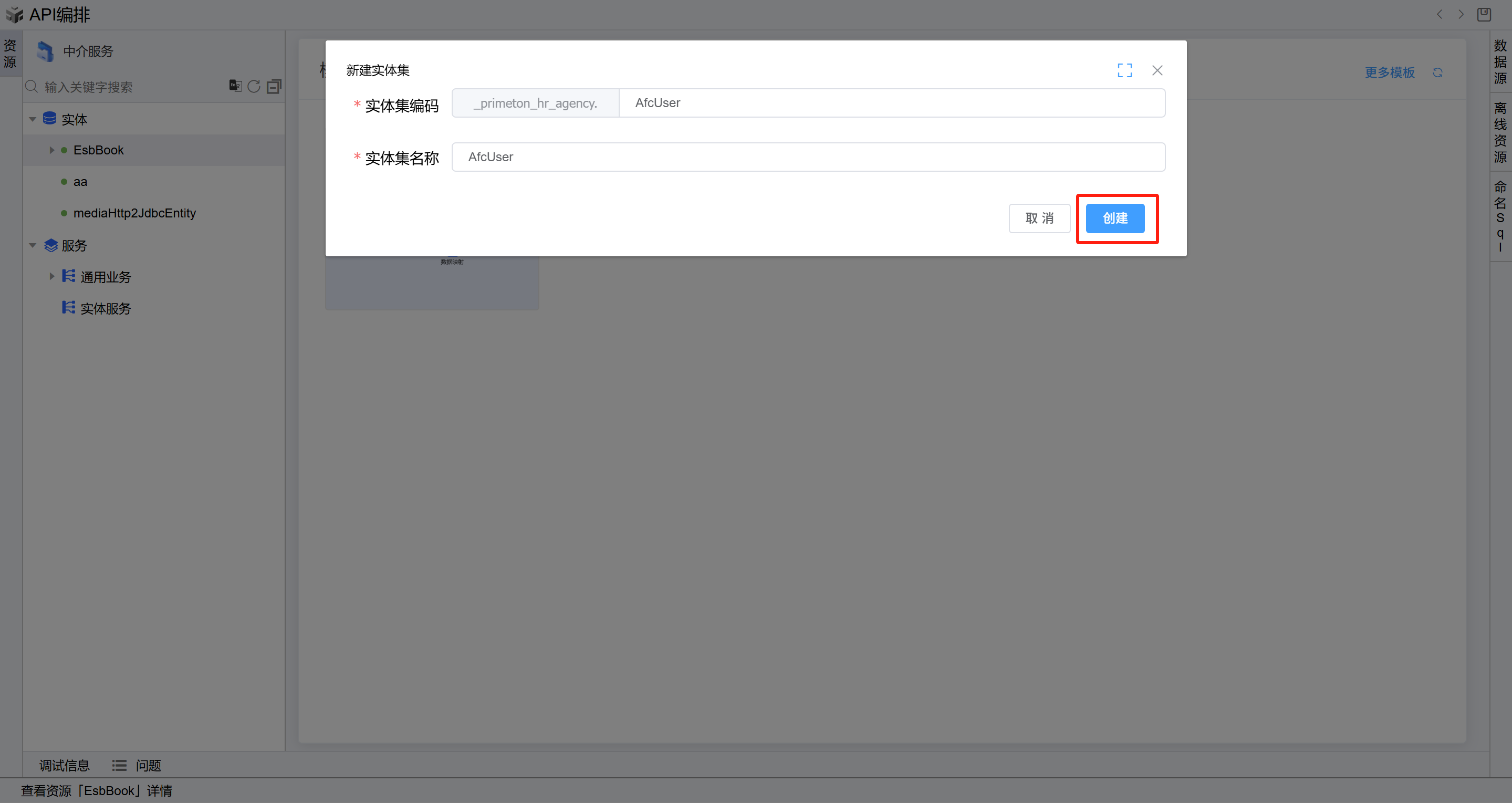 - 在实体集创建页面中,输入实体集编码,实体集名称,点击”创建“按钮,完成实体集创建。
