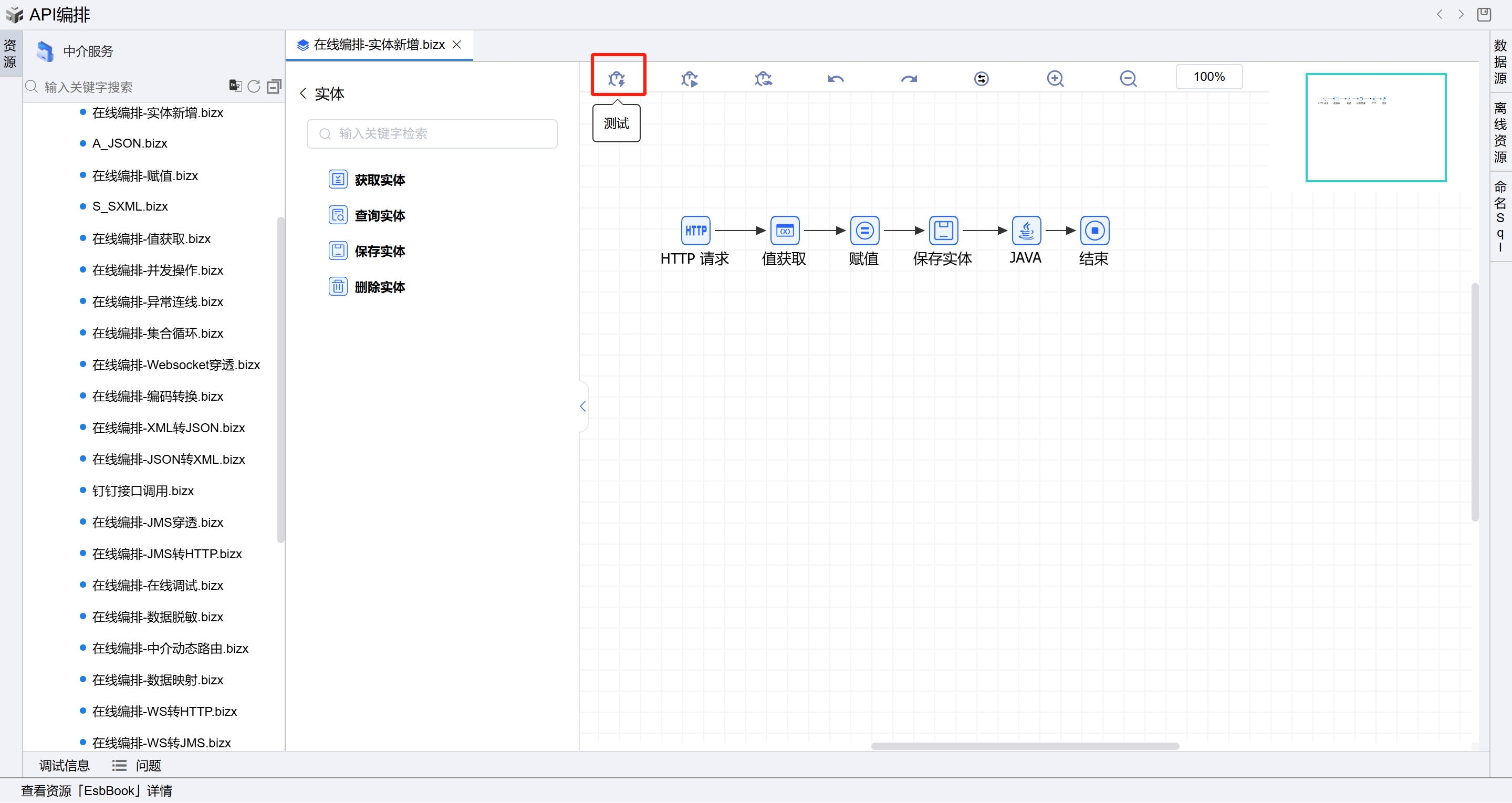 在线编排页面保存成功后,点击界面上方的测试按钮,如下图:
