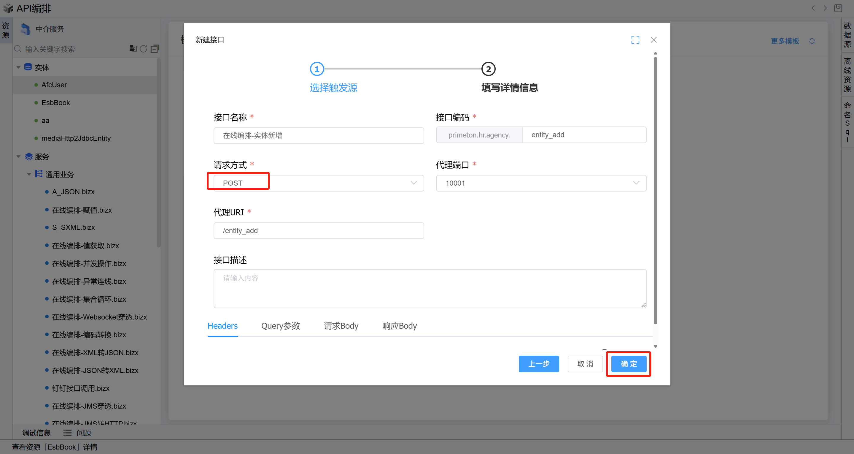 - 在线编排页面中,在通用业务目录上点击右键,点击新建,点击新建HTTP接口,然后如下图所示填写数据并点击保存确定。