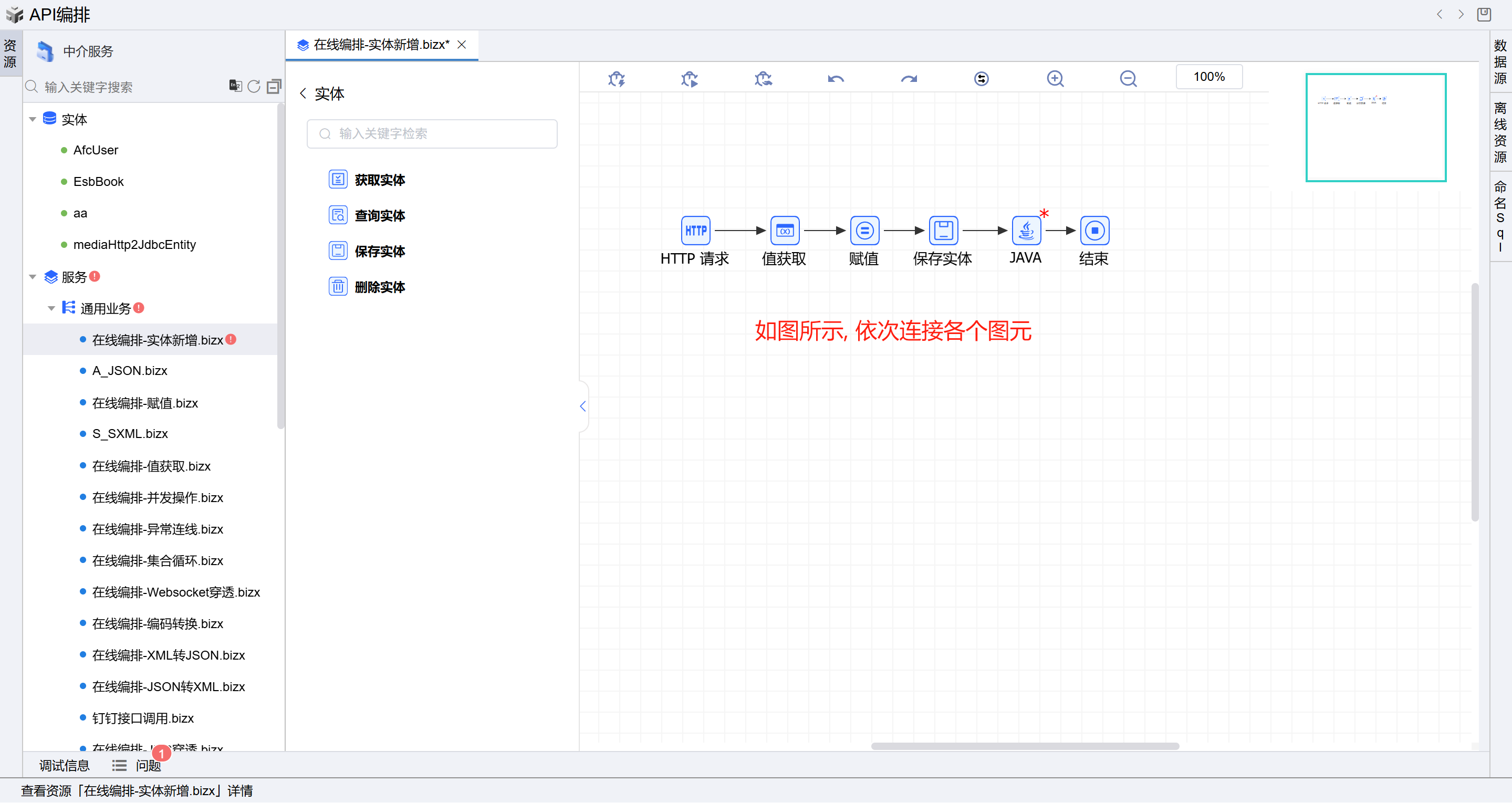 保存成功后系统自动打开中介编排页面,如下图所示。从左侧拖一个值获取图元、一个赋值图元、一个JAVA图元,单击实体图元,拖动保存实体图元到右侧画布的HTTP请求和结束图元之间,并如图所示依次连接所有图元。如下图: