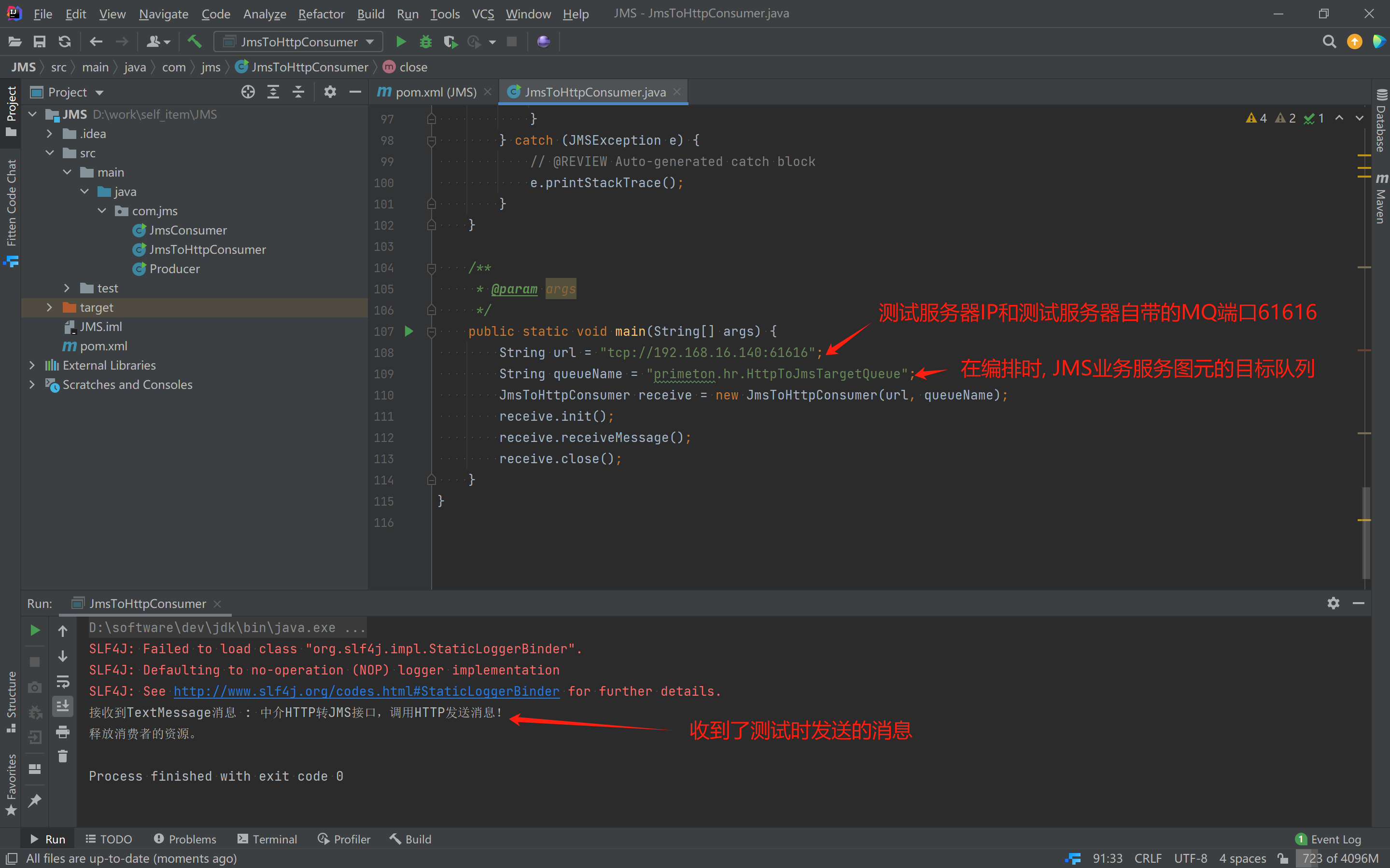 2. 发送消息后下面使用Java代码调用,JMS.zip,下载后使用开发工具打开。 调用JmsToHttpConsumer类的Main方法接收消息,ip为测试服务器IP,端口为61616端口,queueName值为服务编排时,JMS业务服务图元中,填写的目标队列为primeton.hr.HttpToJmsTargetQueue,然后执行Main方法。如下图: