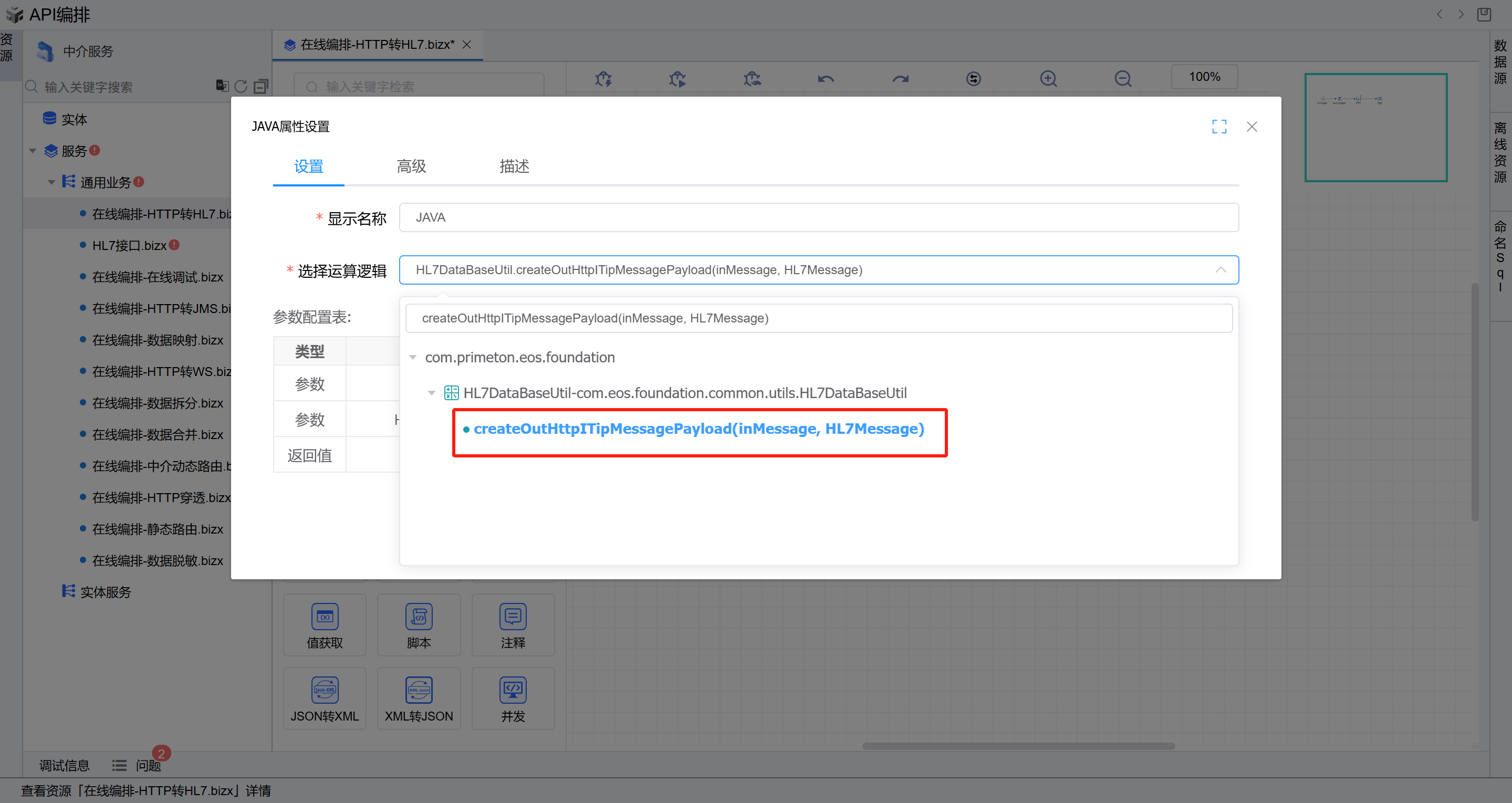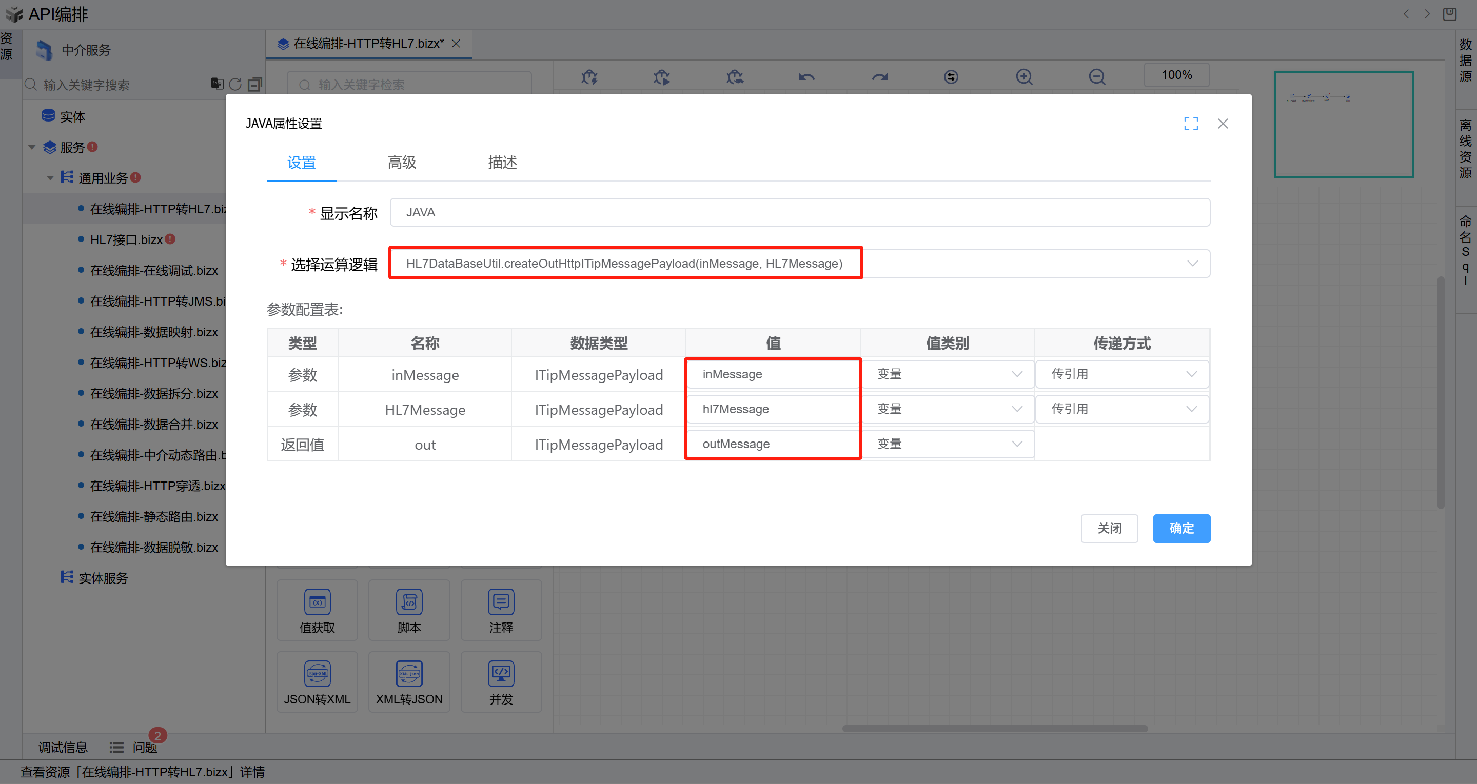 双击打开JAVA图元,选择运算逻辑HL7DataBaseUtil.createOutHttpITipMessagePayload(inMessage, HL7Message)。然后按下图所示填写参数,点击确定。