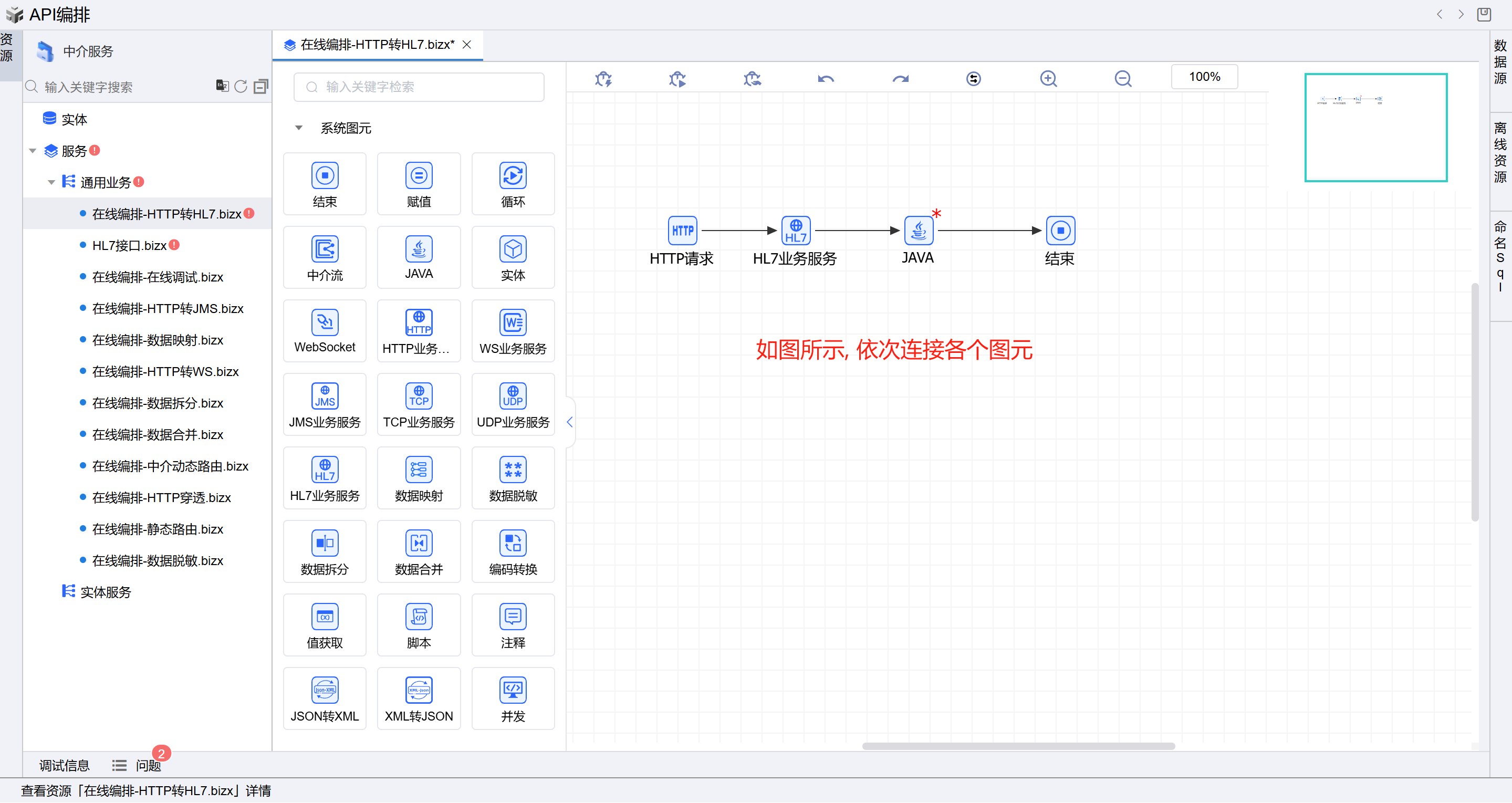 保存成功后系统自动打开中介编排页面。从左侧拖一个HL7业务服务图元和JAVA图元到开始和结束中间,并依次连接各个图元。如下图: