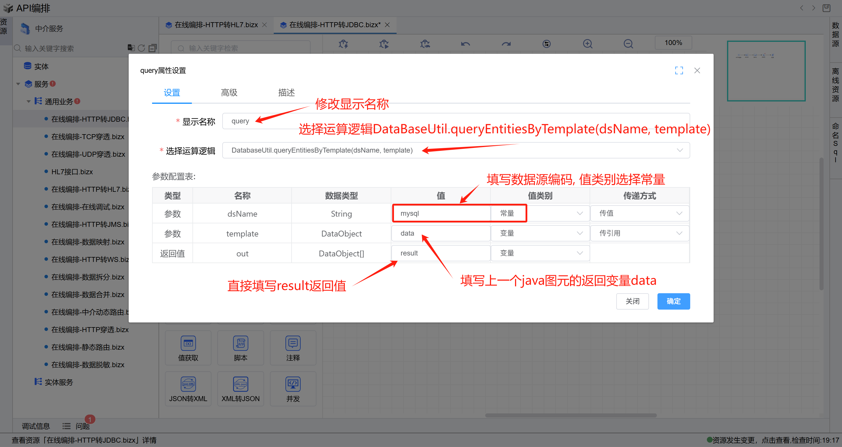 打开第二个JAVA图元修改显示名称为query,选择运算逻辑DataBaseUtil.queryEntitiesByTemplate(dsName, template);参数1填写当前数据源编码,参数2填上个图元的返回值data,返回值填写result并点击确定。如下图: