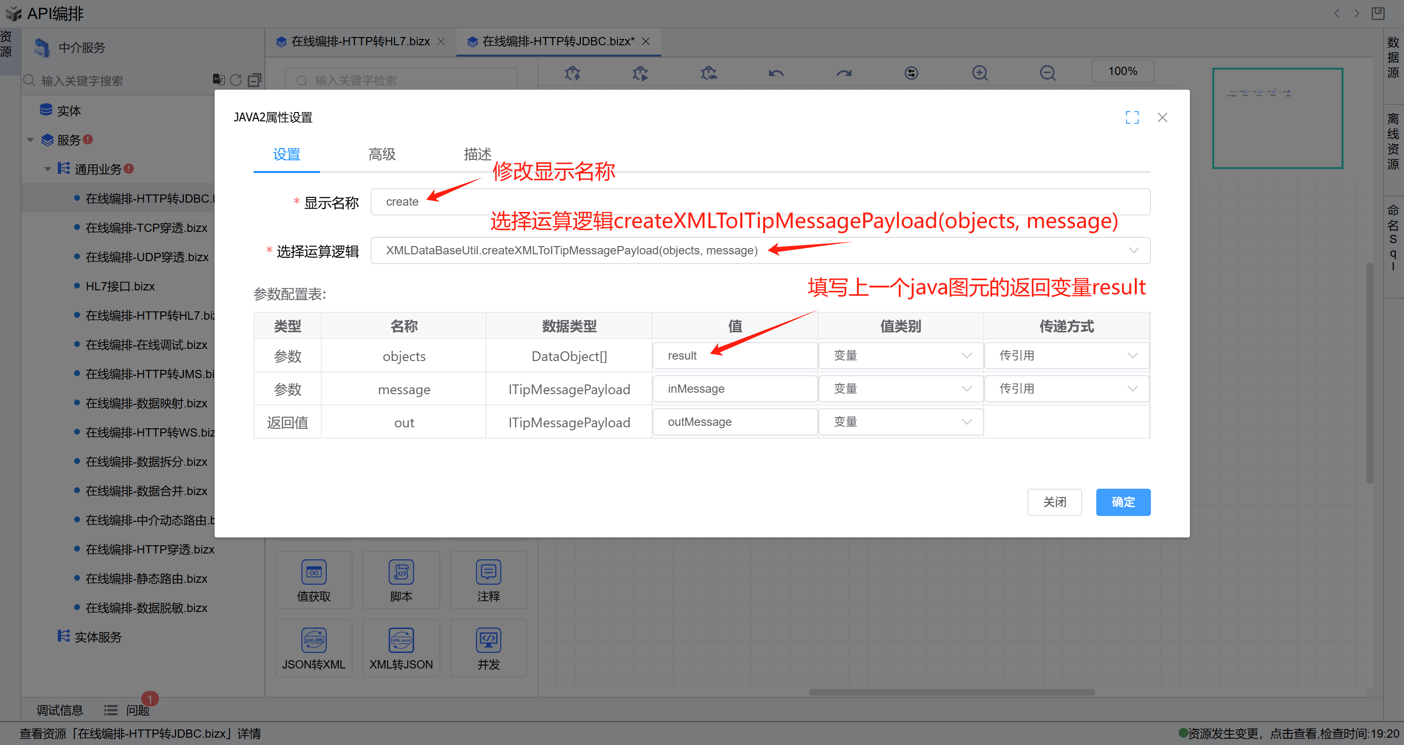打开第三个JAVA图元修改显示名称为create,选择运算逻辑XMLDataBaseUtil.createXMLToITipMessagePayload(objects, message),第一个参数填写result,第二个参数和返回值填写inMessage和outMessage并点击确定。如下图: