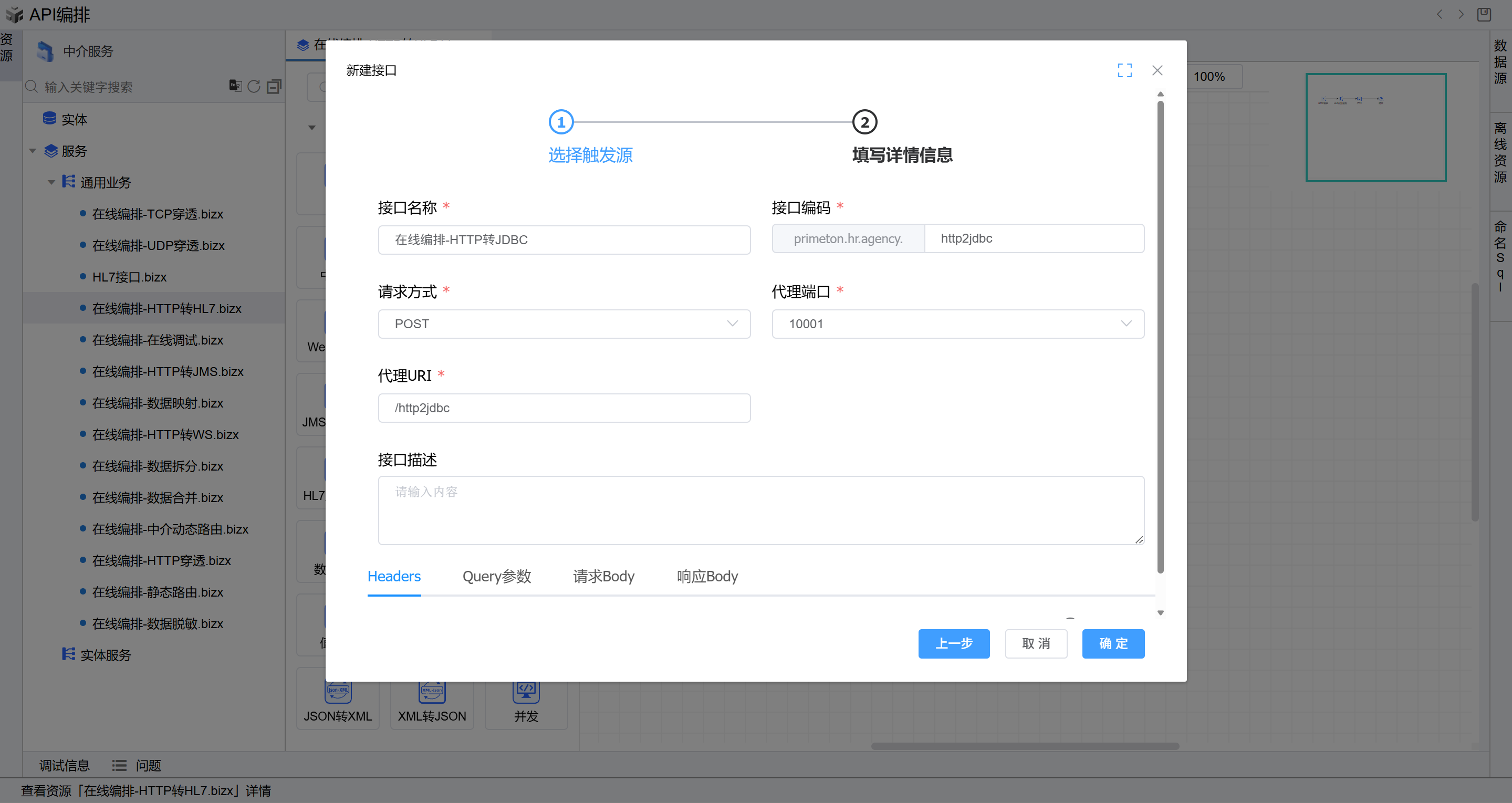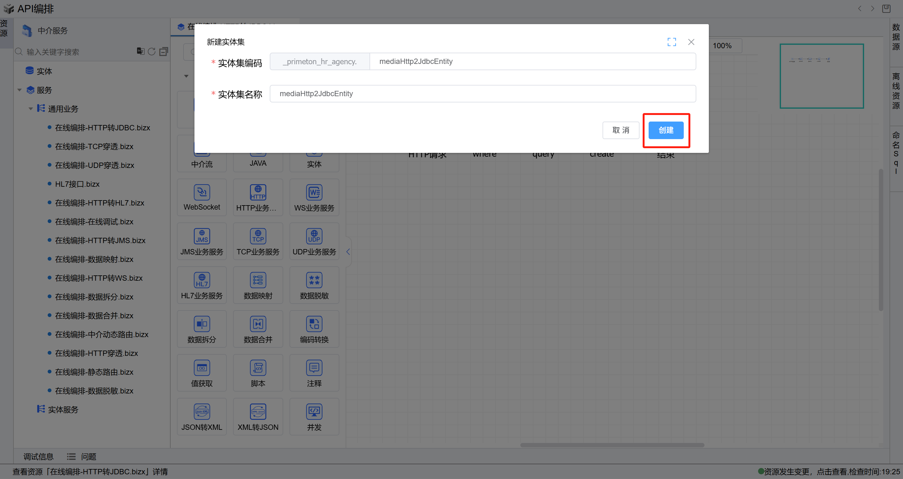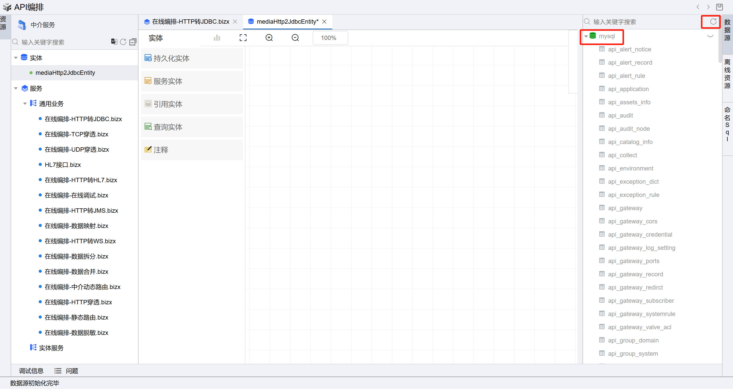 选择左侧树上中介服务节点,点击API创建按钮,选择右侧的”API编排“页签,点击”API编排“按钮,进入在线编排页面。