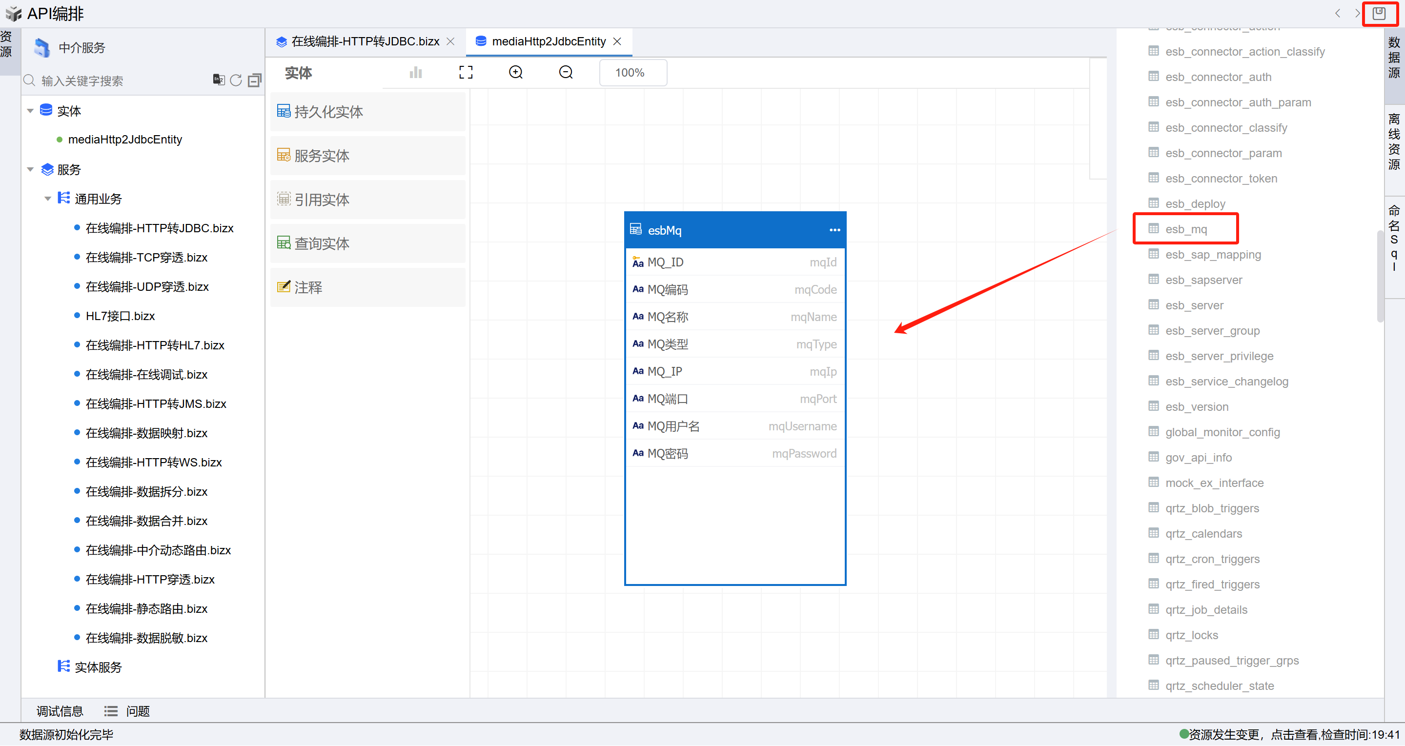 点击右侧数据源(如果实际已存在数据源,但没显示,可点击数据源的刷新按钮),从数据源拖入实体到中介空白处。然后点击右上角的保存按钮, 或者按下