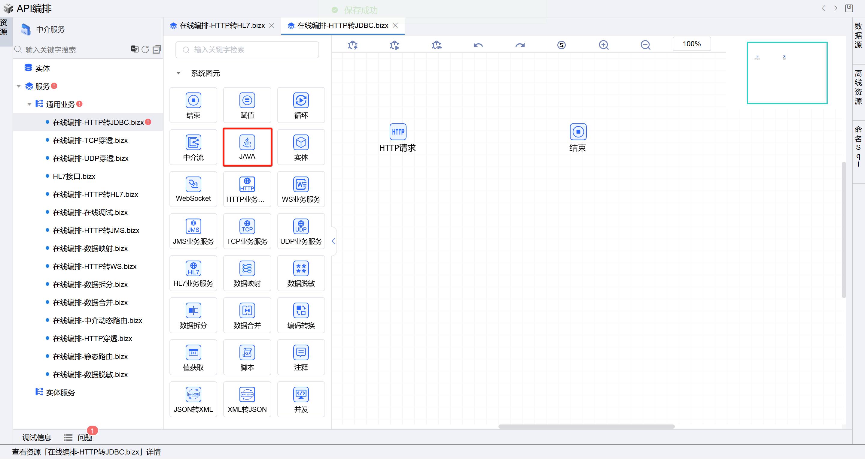 保存成功后系统自动打开中介编排页面。从左侧拖三个JAVA图元到开始和结束中间并依次连接各个图元。如下图: