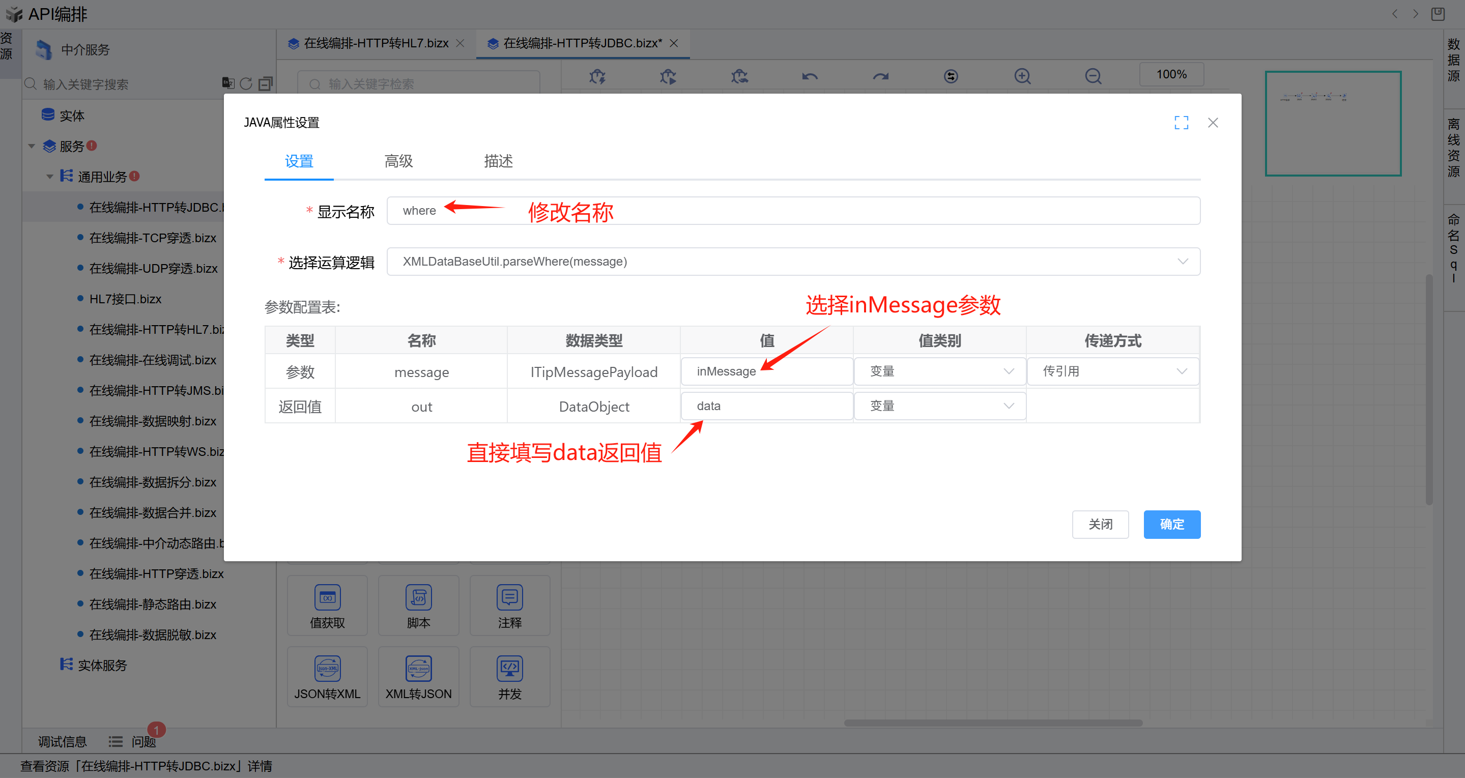 打开第一个JAVA图元修改显示名称为where,选择运算逻辑XMLDataBaseUtil.parseWhere(message)方法,输入参数是ITipMessagePayload类型的inMessage,输入参数是DataObject类型的data。如下图: