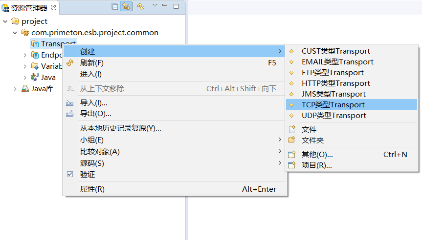 创建的ESB工程中,在资源管理器中,选择"Transport"菜单项,点击右键,选择"创建->TCP类型Transport",如下图所示: