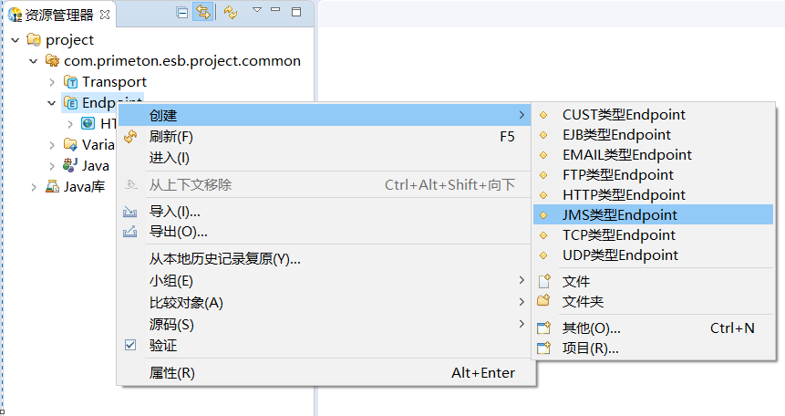 1. 在资源管理器中,右键点击公共Module中"Endpoint",选择"创建->JMS类型Endpoint"菜单项,如下所示: