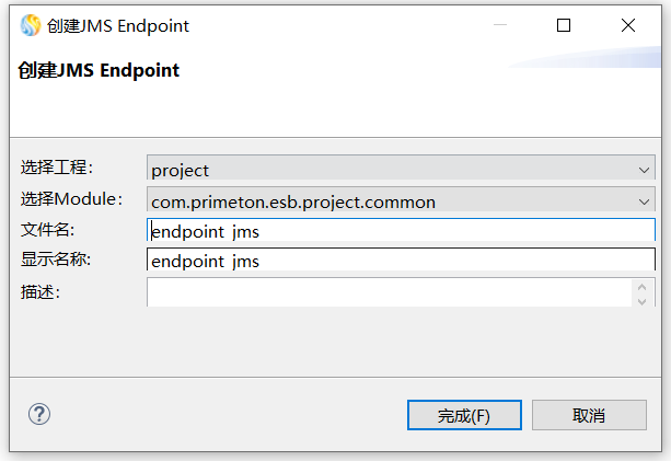 2. 在弹出的"创建JMS类型Endpoint"向导中,选择当前的工程、Module,并输入文件名及显示名称,点击"完成"按钮,如下: