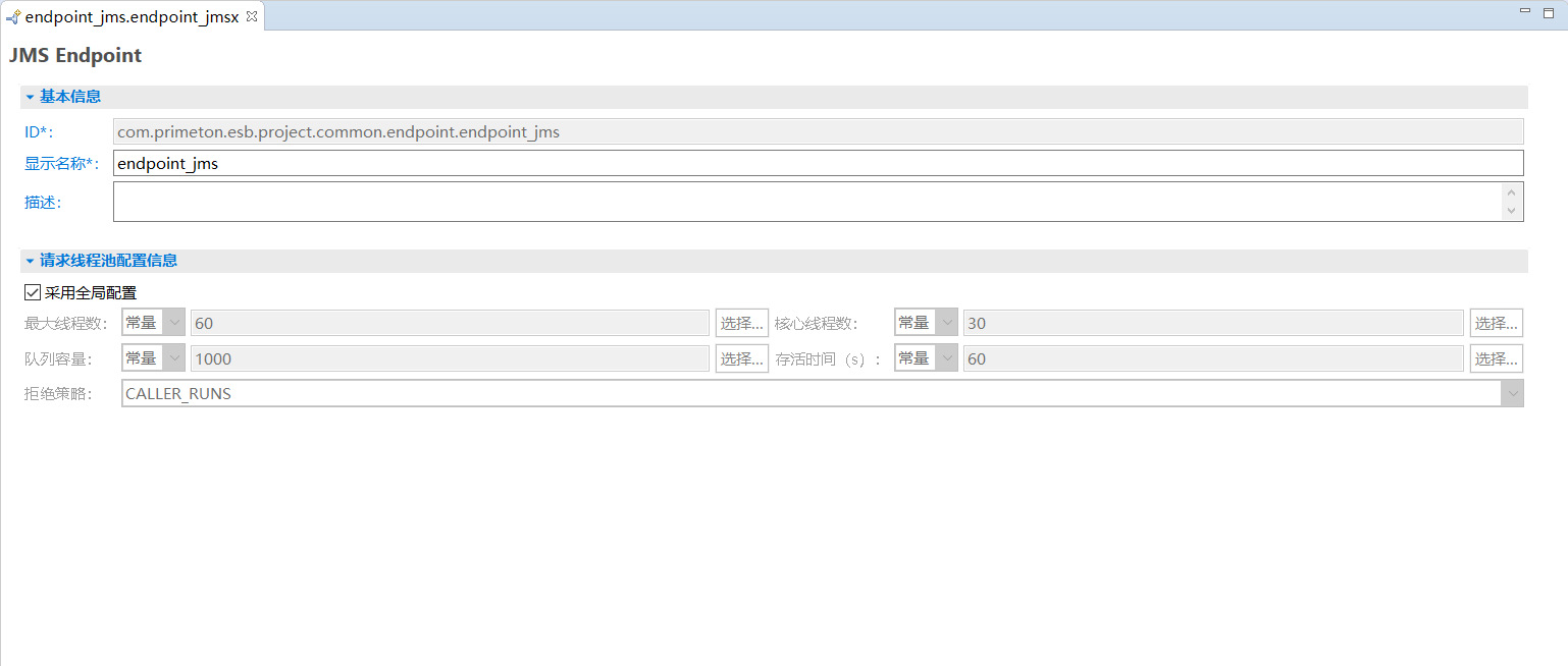 • 显示名称:JMS Endpoint的显示名。 线程池配置信息参考:线程池配置信息 JMS Endpoint配置项填写规则如下: