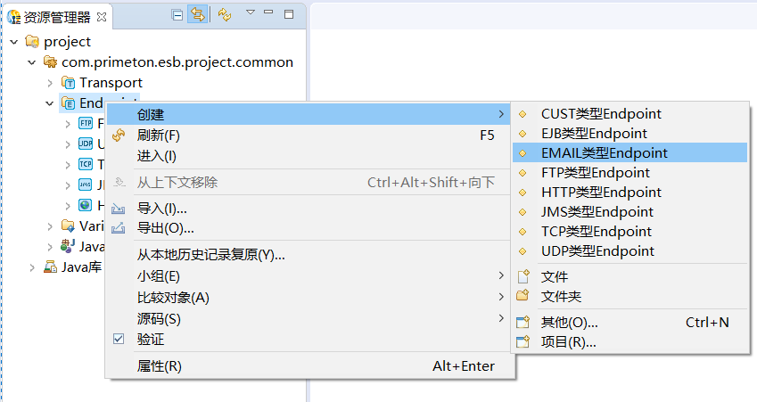 1. 在资源管理器中,右键点击公共Module中"Endpoint",选择"创建->EMAIL类型Endpoint"菜单项,如下所示: