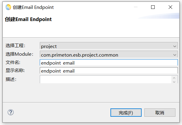 2. 在弹出的"创建EMAIL类型Endpoint"向导中,选择当前的工程、Module,并输入文件名及显示名称,点击"完成"按钮,如下: