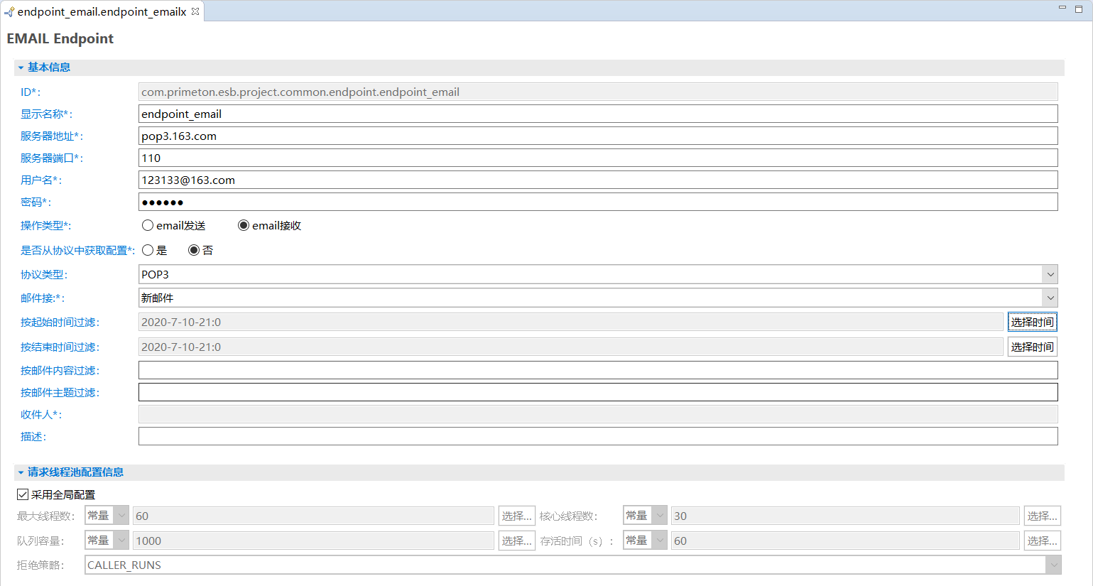 • 文件名:用于存储EMAIL Endpoint配置的文件名。需要保证在ESB工程中唯一。