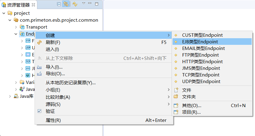 在资源管理器中,选中新建的公共Module中的"Endpoint",点击右键,选择"创建->EJB类型Endpoint"菜单项,创建EJB Endpoint,如下图所示: