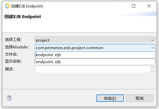 2.在弹出的"创建EJB类型Endpoint"向导中,选择当前的工程、Module,并输入文件名及显示名称,点击"完成"按钮,如下: