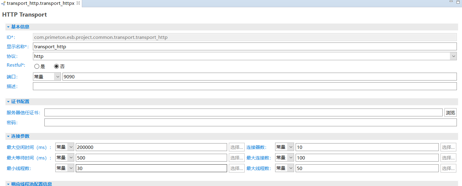 2.在"创建Http类型Transport"向导中,输入HttpTransport的相关信息,点击"完成"按钮,创建HttpTransport。